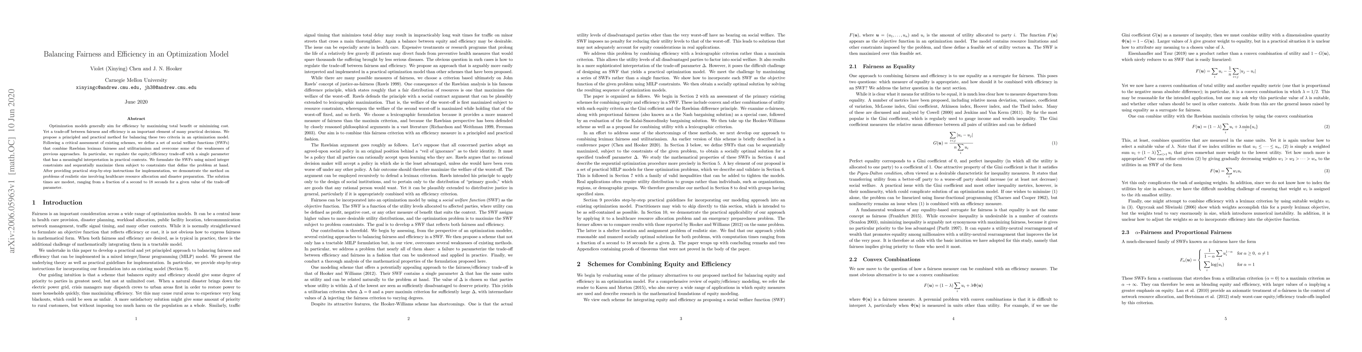 Researchers propose a method to balance fairness and efficiency in optimization models using social welfare functions that combine Rawlsian leximax fairness and utilitarianism, achieving modest solution times of seconds.