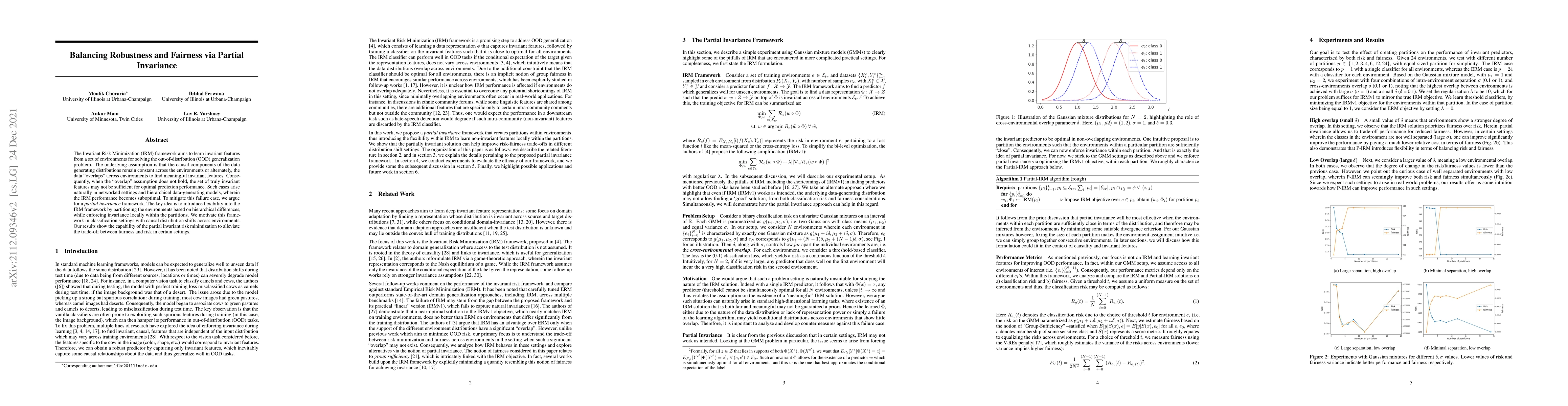 The Invariant Risk Minimization (IRM) framework aims to learn invariant features from a set of environments for solving the out-of-distribution (OOD) generalization problem. The underlying assumption is that the causal components of the data generating distributions remain constant across the environments or alternately, the data "overlaps" across environments to find meaningful invariant features. Consequently, when the "overlap" assumption does not hold, the set of truly invariant features may not be sufficient for optimal prediction performance. Such cases arise naturally in networked settings and hierarchical data-generating models, wherein the IRM performance becomes suboptimal. To mitigate this failure case, we argue for a partial invariance framework. The key idea is to introduce flexibility into the IRM framework by partitioning the environments based on hierarchical differences, while enforcing invariance locally within the partitions. We motivate this framework in classification settings with causal distribution shifts across environments. Our results show the capability of the partial invariant risk minimization to alleviate the trade-off between fairness and risk in certain settings.