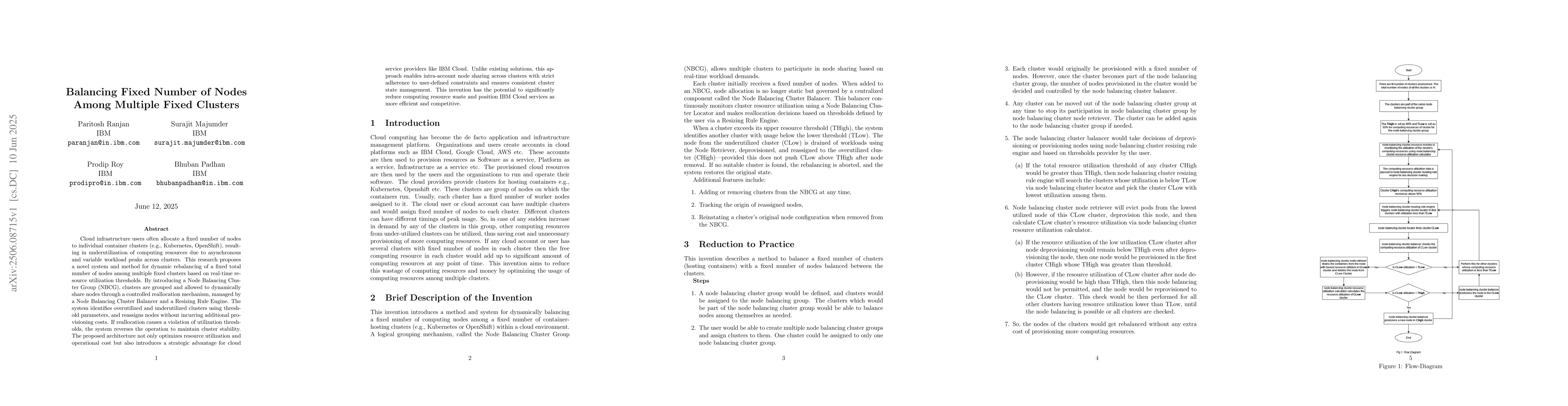 Cloud infrastructure users often allocate a fixed number of nodes to individual container clusters (e.g., Kubernetes, OpenShift), resulting in underutilization of computing resources due to asynchronous and variable workload peaks across clusters. This research proposes a novel system and method for dynamic rebalancing of a fixed total number of nodes among multiple fixed clusters based on real-time resource utilization thresholds. By introducing a Node Balancing Cluster Group (NBCG), clusters are grouped and allowed to dynamically share nodes through a controlled reallocation mechanism, managed by a Node Balancing Cluster Balancer and a Resizing Rule Engine. The system identifies overutilized and underutilized clusters using threshold parameters, and reassigns nodes without incurring additional provisioning costs. If reallocation causes a violation of utilization thresholds, the system reverses the operation to maintain cluster stability. The proposed architecture not only optimizes resource utilization and operational cost but also introduces a strategic advantage for cloud service providers like IBM Cloud. Unlike existing solutions, this approach enables intra-account node sharing across clusters with strict adherence to user-defined constraints and ensures consistent cluster state management. This invention has the potential to significantly reduce computing resource waste and position IBM Cloud services as more efficient and competitive.