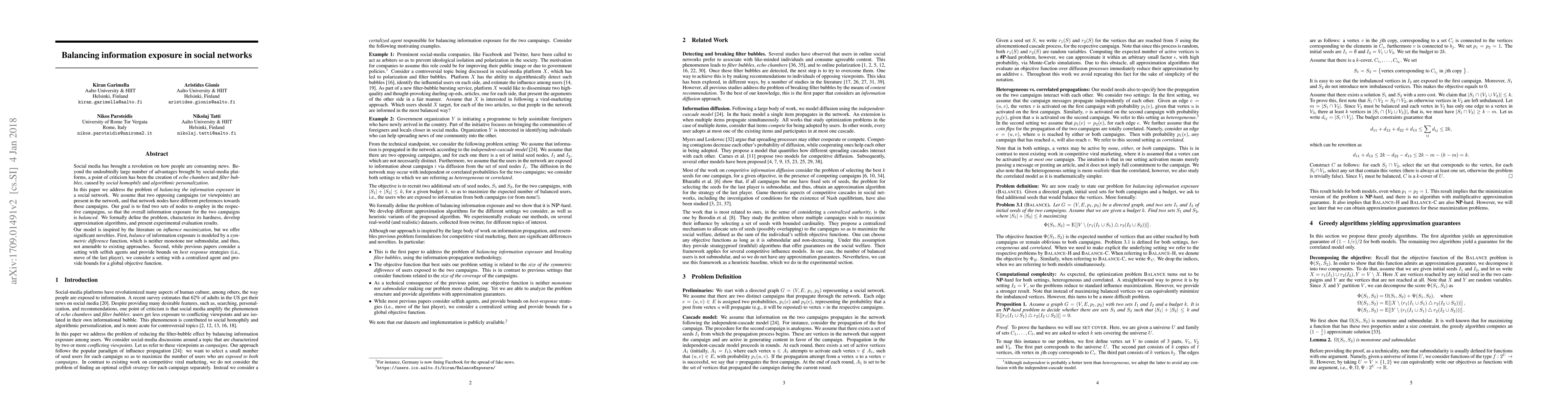 This paper proposes a method to balance information exposure in social networks, addressing echo chambers and filter bubbles. It introduces a symmetric difference function to model balance and presents approximation algorithms, providing experimental evaluation and contrasting with previous selfish-agent models focusing on a centralized agent and global objective function.