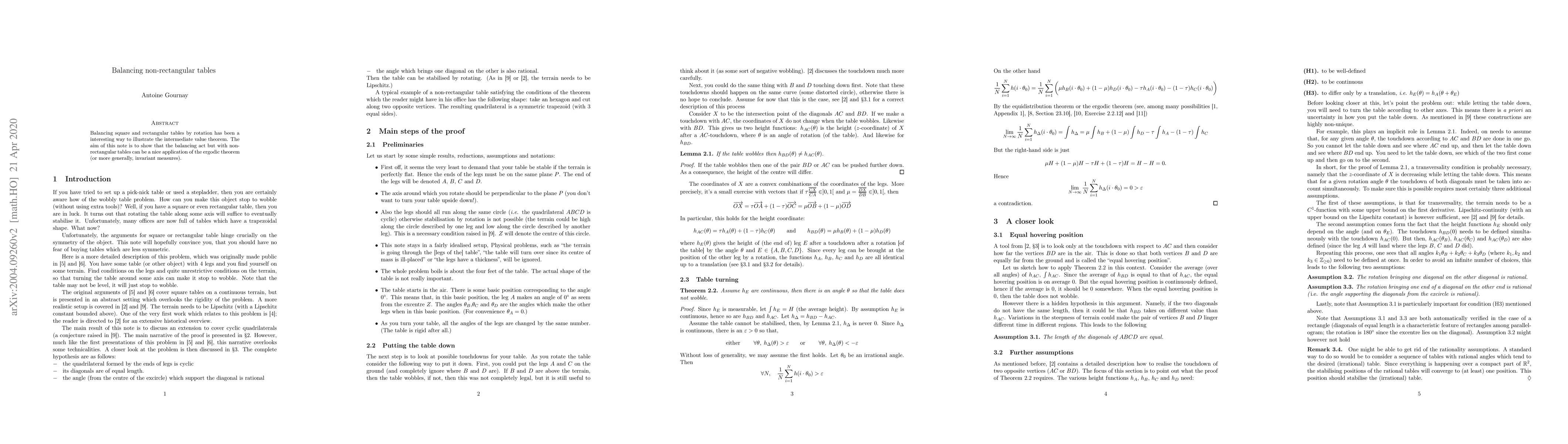 Balancing square and rectangular tables by rotation has been a interesting way to illustrate the intermediate value theorem. The aim of this note is to show that the balancing act but with non-rectangular tables can be a nice application of the ergodic theorem (or more generally, invariant measures).