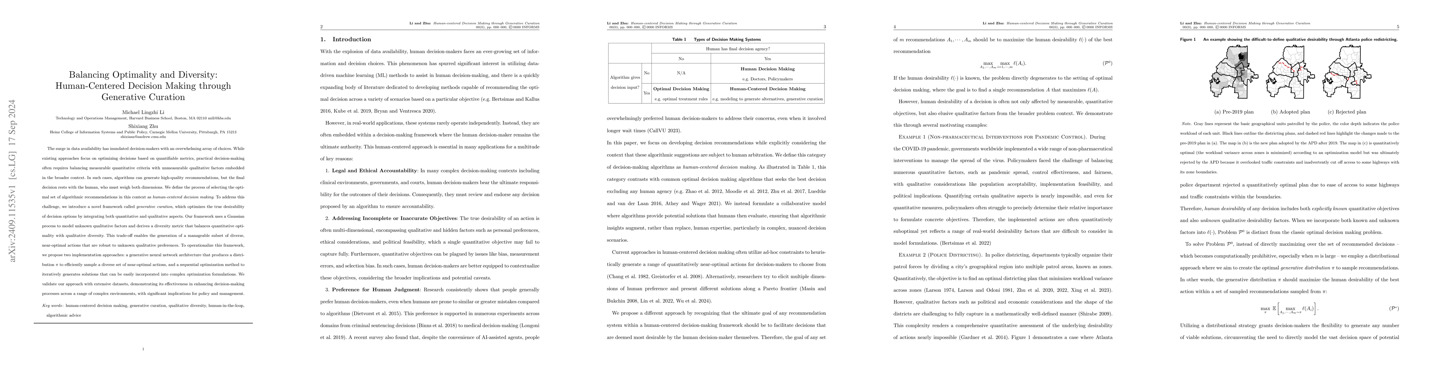 The surge in data availability has inundated decision-makers with an overwhelming array of choices. While existing approaches focus on optimizing decisions based on quantifiable metrics, practical decision-making often requires balancing measurable quantitative criteria with unmeasurable qualitative factors embedded in the broader context. In such cases, algorithms can generate high-quality recommendations, but the final decision rests with the human, who must weigh both dimensions. We define the process of selecting the optimal set of algorithmic recommendations in this context as human-centered decision making. To address this challenge, we introduce a novel framework called generative curation, which optimizes the true desirability of decision options by integrating both quantitative and qualitative aspects. Our framework uses a Gaussian process to model unknown qualitative factors and derives a diversity metric that balances quantitative optimality with qualitative diversity. This trade-off enables the generation of a manageable subset of diverse, near-optimal actions that are robust to unknown qualitative preferences. To operationalize this framework, we propose two implementation approaches: a generative neural network architecture that produces a distribution $\pi$ to efficiently sample a diverse set of near-optimal actions, and a sequential optimization method to iteratively generates solutions that can be easily incorporated into complex optimization formulations. We validate our approach with extensive datasets, demonstrating its effectiveness in enhancing decision-making processes across a range of complex environments, with significant implications for policy and management.