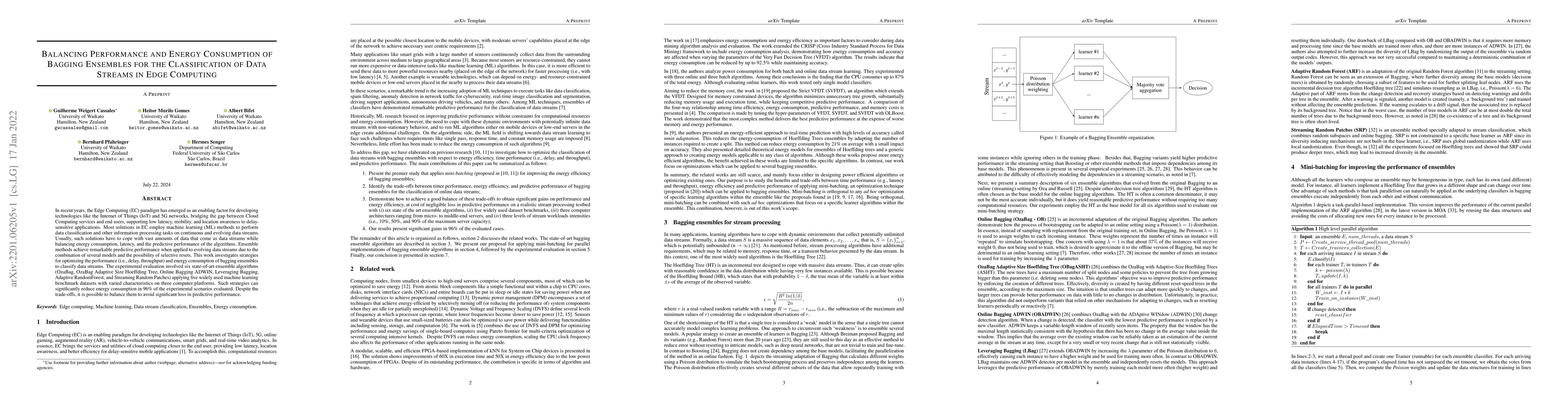 In recent years, the Edge Computing (EC) paradigm has emerged as an enabling factor for developing technologies like the Internet of Things (IoT) and 5G networks, bridging the gap between Cloud Computing services and end-users, supporting low latency, mobility, and location awareness to delay-sensitive applications. Most solutions in EC employ machine learning (ML) methods to perform data classification and other information processing tasks on continuous and evolving data streams. Usually, such solutions have to cope with vast amounts of data that come as data streams while balancing energy consumption, latency, and the predictive performance of the algorithms. Ensemble methods achieve remarkable predictive performance when applied to evolving data streams due to the combination of several models and the possibility of selective resets. This work investigates strategies for optimizing the performance (i.e., delay, throughput) and energy consumption of bagging ensembles to classify data streams. The experimental evaluation involved six state-of-art ensemble algorithms (OzaBag, OzaBag Adaptive Size Hoeffding Tree, Online Bagging ADWIN, Leveraging Bagging, Adaptive RandomForest, and Streaming Random Patches) applying five widely used machine learning benchmark datasets with varied characteristics on three computer platforms. Such strategies can significantly reduce energy consumption in 96% of the experimental scenarios evaluated. Despite the trade-offs, it is possible to balance them to avoid significant loss in predictive performance.