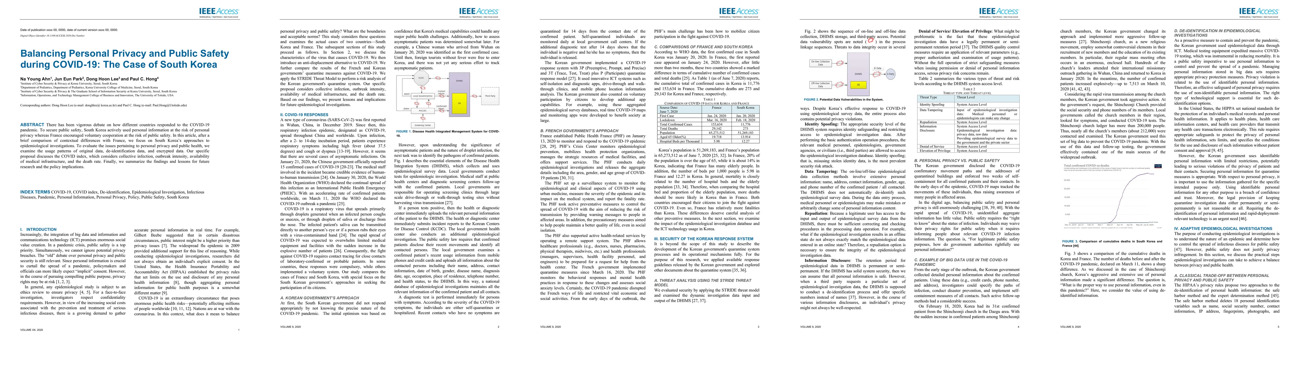 This paper examines South Korea's use of personal data to balance personal privacy and public safety during COVID-19, contrasting it with France's voluntary approach. It proposes a COVID index to evaluate infection patterns and outlines lessons for future research and policy.