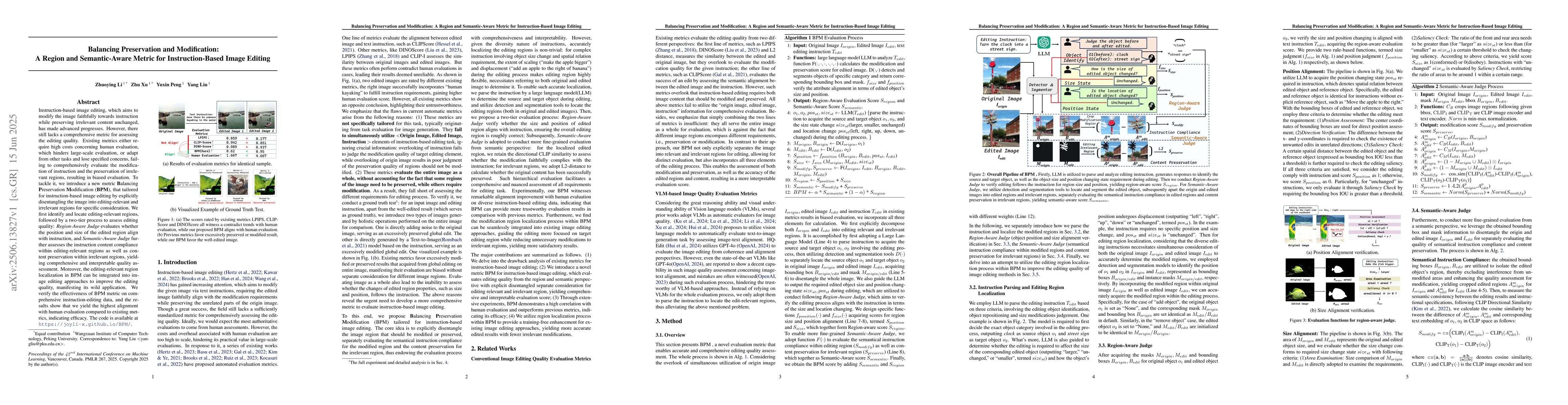 The research introduces a new metric, Balancing Preservation and Modification (BPM), designed for evaluating instruction-based image editing. BPM disentangles images into editing-relevant and irrelevant regions, assessing editing quality via Region-Aware and Semantic-Aware Judges. It offers comprehensive, interpretable assessments and can enhance editing approaches, outperforming existing metrics in aligning with human evaluations.