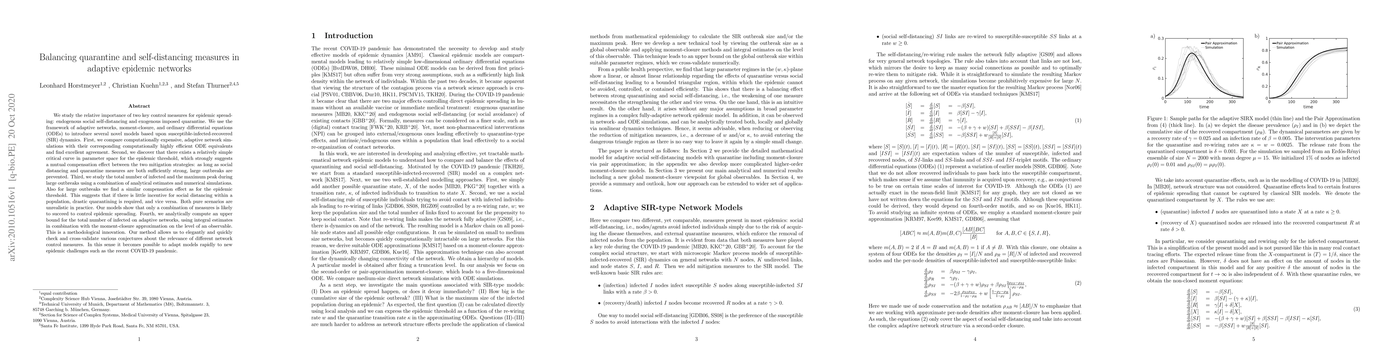 We study the relative importance of two key control measures for epidemic spreading: endogenous social self-distancing and exogenous imposed quarantine. We use the framework of adaptive networks, moment-closure, and ordinary differential equations (ODEs) to introduce several novel models based upon susceptible-infected-recovered (SIR) dynamics. First, we compare computationally expensive, adaptive network simulations with their corresponding computationally highly efficient ODE equivalents and find excellent agreement. Second, we discover that there exists a relatively simple critical curve in parameter space for the epidemic threshold, which strongly suggests that there is a mutual compensation effect between the two mitigation strategies: as long as social distancing and quarantine measures are both sufficiently strong, large outbreaks are prevented. Third, we study the total number of infected and the maximum peak during large outbreaks using a combination of analytical estimates and numerical simulations. Also for large outbreaks we find a similar compensation effect as for the epidemic threshold. This suggests that if there is little incentive for social distancing within a population, drastic quarantining is required, and vice versa. Both pure scenarios are unrealistic in practice. Our models show that only a combination of measures is likely to succeed to control epidemic spreading. Fourth, we analytically compute an upper bound for the total number of infected on adaptive networks, using integral estimates in combination with the moment-closure approximation on the level of an observable. This is a methodological innovation. Our method allows us to elegantly and quickly check and cross-validate various conjectures about the relevance of different network control measures.