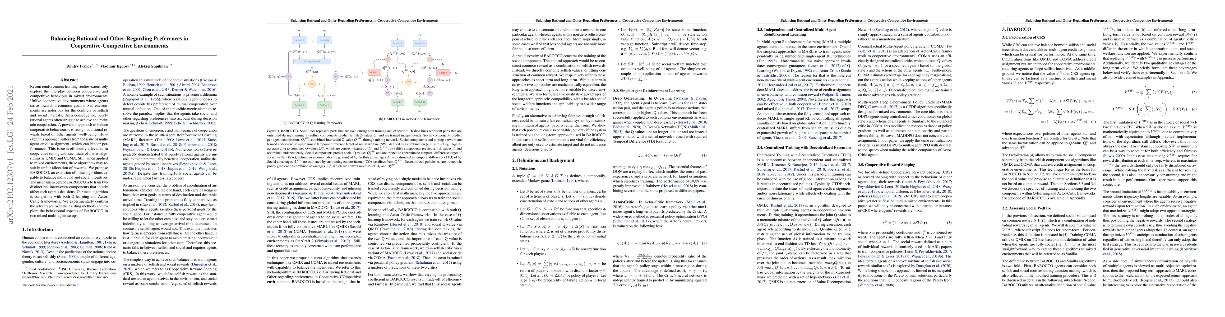 This paper proposes BAROCCO, an extension of reinforcement learning algorithms QMIX and COMA, to balance rational and other-regarding preferences in cooperative-competitive environments. BAROCCO trains two interwoven components to manage individual and social incentives, demonstrating improved performance and fairness over existing methods in mixed multi-agent setups.