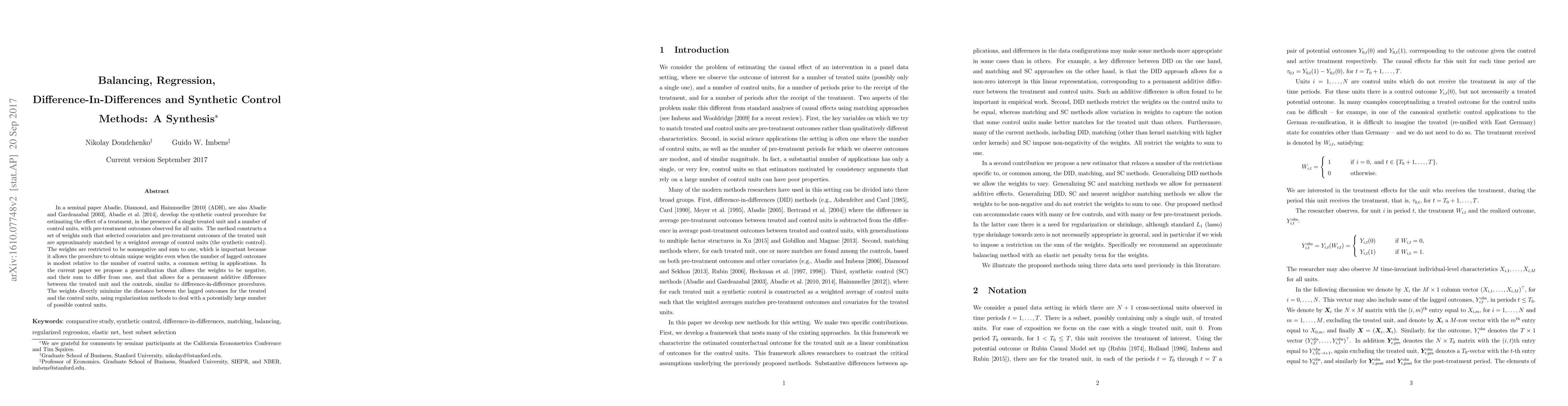 In a seminal paper Abadie, Diamond, and Hainmueller [2010] (ADH), see also Abadie and Gardeazabal [2003], Abadie et al. [2014], develop the synthetic control procedure for estimating the effect of a treatment, in the presence of a single treated unit and a number of control units, with pre-treatment outcomes observed for all units. The method constructs a set of weights such that selected covariates and pre-treatment outcomes of the treated unit are approximately matched by a weighted average of control units (the synthetic control). The weights are restricted to be nonnegative and sum to one, which is important because it allows the procedure to obtain unique weights even when the number of lagged outcomes is modest relative to the number of control units, a common setting in applications. In the current paper we propose a generalization that allows the weights to be negative, and their sum to differ from one, and that allows for a permanent additive difference between the treated unit and the controls, similar to difference-in-difference procedures. The weights directly minimize the distance between the lagged outcomes for the treated and the control units, using regularization methods to deal with a potentially large number of possible control units.