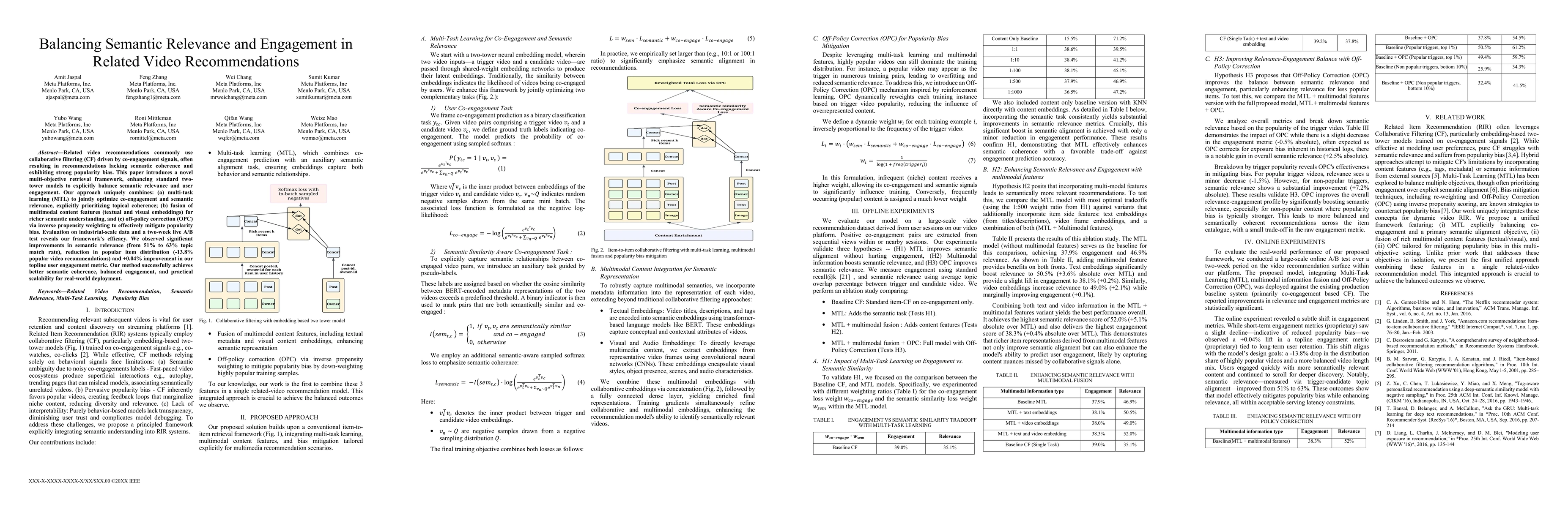 Related video recommendations commonly use collaborative filtering (CF) driven by co-engagement signals, often resulting in recommendations lacking semantic coherence and exhibiting strong popularity bias. This paper introduces a novel multi-objective retrieval framework, enhancing standard two-tower models to explicitly balance semantic relevance and user engagement. Our approach uniquely combines: (a) multi-task learning (MTL) to jointly optimize co-engagement and semantic relevance, explicitly prioritizing topical coherence; (b) fusion of multimodal content features (textual and visual embeddings) for richer semantic understanding; and (c) off-policy correction (OPC) via inverse propensity weighting to effectively mitigate popularity bias. Evaluation on industrial-scale data and a two-week live A/B test reveals our framework's efficacy. We observed significant improvements in semantic relevance (from 51% to 63% topic match rate), a reduction in popular item distribution (-13.8% popular video recommendations), and a +0.04% improvement in our topline user engagement metric. Our method successfully achieves better semantic coherence, balanced engagement, and practical scalability for real-world deployment.