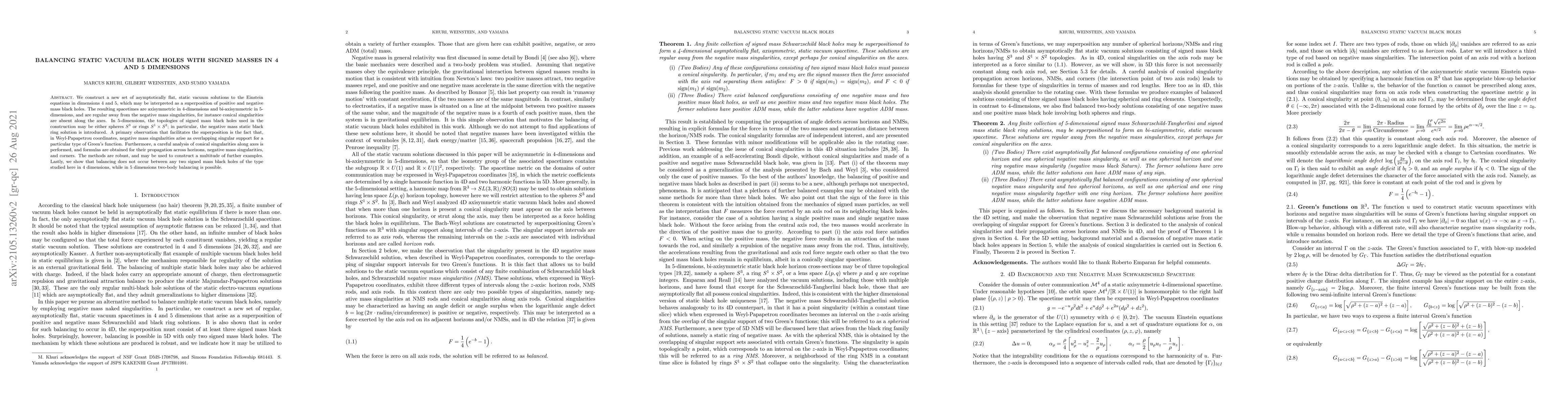 We construct a new set of asymptotically flat, static vacuum solutions to the Einstein equations in dimensions 4 and 5, which may be interpreted as a superposition of positive and negative mass black holes. The resulting spacetimes are axisymmetric in 4-dimensions and bi-axisymmetric in 5-dimensions, and are regular away from the negative mass singularities, for instance conical singularities are absent along the axes. In 5-dimensions, the topologies of signed mass black holes used in the construction may be either spheres $S^3$ or rings $S^1 \times S^2$; in particular, the negative mass static black ring solution is introduced. A primary observation that facilitates the superposition is the fact that, in Weyl-Papapetrou coordinates, negative mass singularities arise as overlapping singular support for a particular type of Green's function. Furthermore, a careful analysis of conical singularities along axes is performed, and formulas are obtained for their propagation across horizons, negative mass singularities, and corners. The methods are robust, and may be used to construct a multitude of further examples. Lastly, we show that balancing does not occur between any two signed mass black holes of the type studied here in 4 dimensions, while in 5 dimensions two-body balancing is possible.