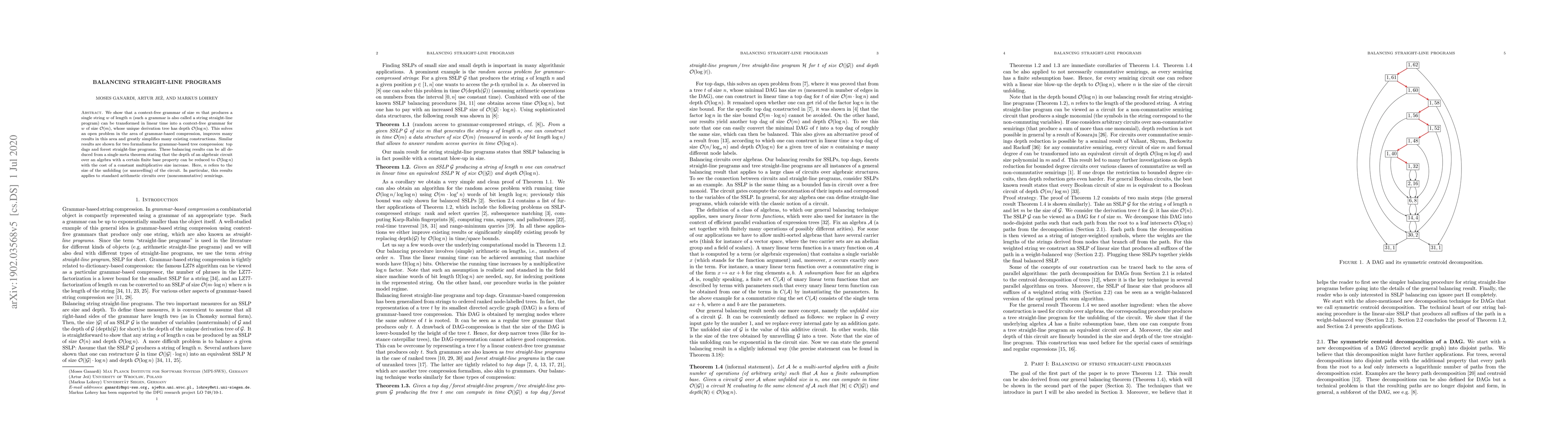 The paper presents a method to transform a context-free grammar of size $m$ producing a single string $w$ into a context-free grammar of size $\mathcal{O}(m)$ with a unique derivation tree of depth $\mathcal{O}(\log |w|)$, applicable to string straight-line programs, top dags, and forest straight-line programs. This transformation is achieved through a meta theorem reducing the depth of algebraic circuits over an algebra with a certain finite base property to $\mathcal{O}(\log n)$ with a constant multiplicative size increase.