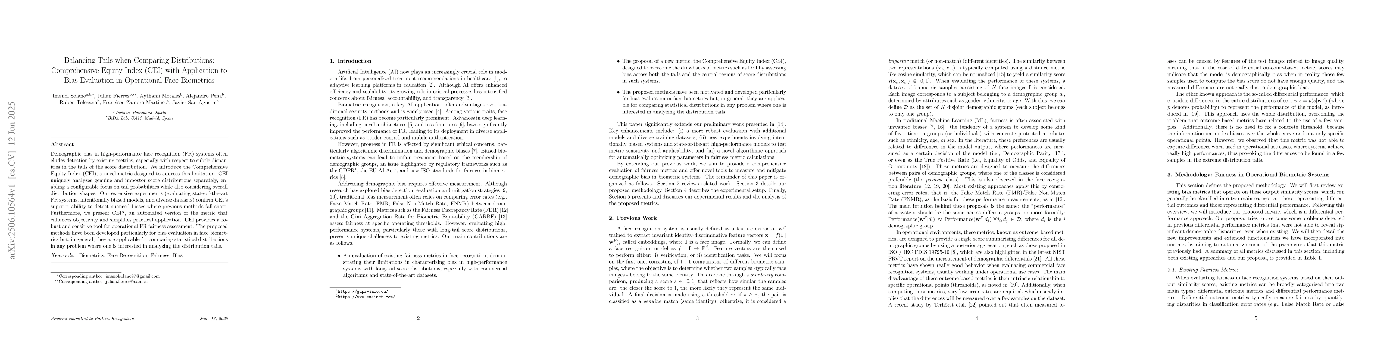 Demographic bias in high-performance face recognition (FR) systems often eludes detection by existing metrics, especially with respect to subtle disparities in the tails of the score distribution. We introduce the Comprehensive Equity Index (CEI), a novel metric designed to address this limitation. CEI uniquely analyzes genuine and impostor score distributions separately, enabling a configurable focus on tail probabilities while also considering overall distribution shapes. Our extensive experiments (evaluating state-of-the-art FR systems, intentionally biased models, and diverse datasets) confirm CEI's superior ability to detect nuanced biases where previous methods fall short. Furthermore, we present CEI^A, an automated version of the metric that enhances objectivity and simplifies practical application. CEI provides a robust and sensitive tool for operational FR fairness assessment. The proposed methods have been developed particularly for bias evaluation in face biometrics but, in general, they are applicable for comparing statistical distributions in any problem where one is interested in analyzing the distribution tails.
