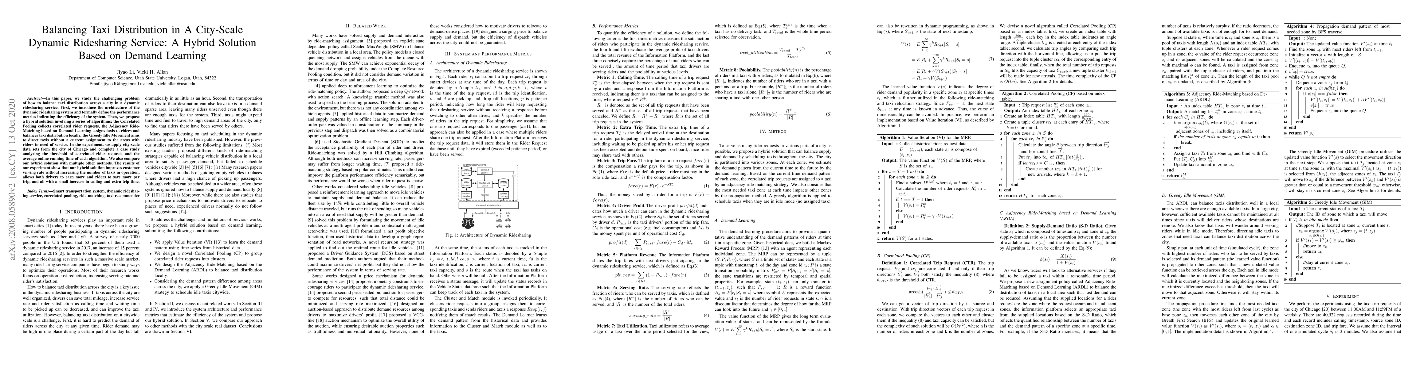 In this paper, we study the challenging problem of how to balance taxi distribution across a city in a dynamic ridesharing service. First, we introduce the architecture of the dynamic ridesharing system and formally define the performance metrics indicating the efficiency of the system. Then, we propose a hybrid solution involving a series of algorithms: the Correlated Pooling collects correlated rider requests, the Adjacency Ride-Matching based on Demand Learning assigns taxis to riders and balances taxi distribution locally, the Greedy Idle Movement aims to direct taxis without a current assignment to the areas with riders in need of service. In the experiment, we apply city-scale data sets from the city of Chicago and complete a case study analyzing the threshold of correlated rider requests and the average online running time of each algorithm. We also compare our hybrid solution with multiple other methods. The results of our experiment show that our hybrid solution improves customer serving rate without increasing the number of taxis in operation, allows both drivers to earn more and riders to save more per trip, and all with a small increase in calling and extra trip time.