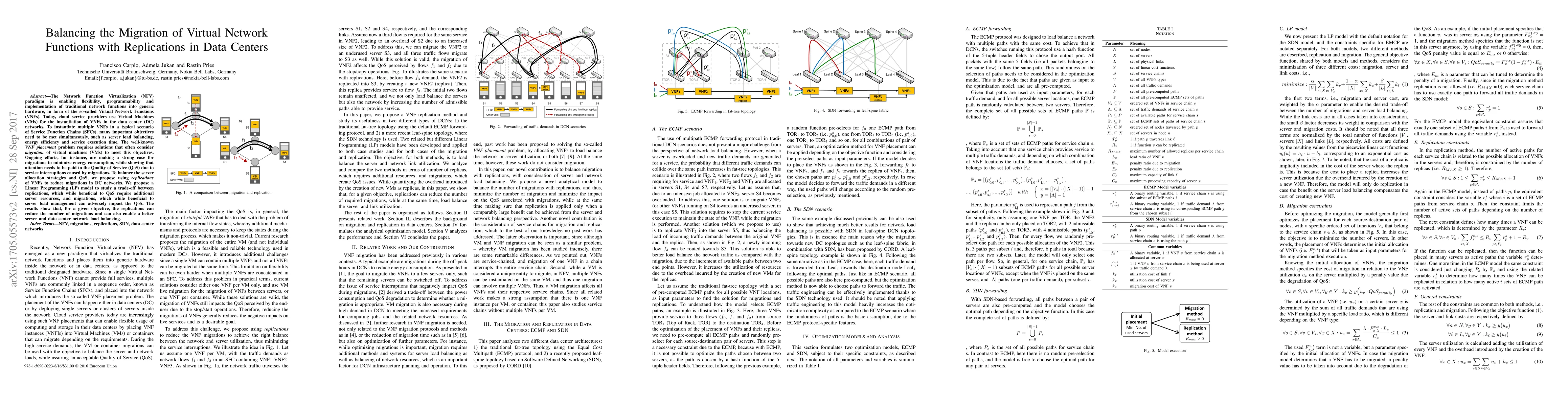 The Network Function Virtualization (NFV) paradigm is enabling flexibility, programmability and implementation of traditional network functions into generic hardware, in form of the so-called Virtual Network Functions (VNFs). Today, cloud service providers use Virtual Machines (VMs) for the instantiation of VNFs in the data center (DC) networks. To instantiate multiple VNFs in a typical scenario of Service Function Chains (SFCs), many important objectives need to be met simultaneously, such as server load balancing, energy efficiency and service execution time. The well-known \emph{VNF placement} problem requires solutions that often consider \emph{migration} of virtual machines (VMs) to meet this objectives. Ongoing efforts, for instance, are making a strong case for migrations to minimize energy consumption, while showing that attention needs to be paid to the Quality of Service (QoS) due to service interruptions caused by migrations. To balance the server allocation strategies and QoS, we propose using \emph{replications} of VNFs to reduce migrations in DC networks. We propose a Linear Programming (LP) model to study a trade-off between replications, which while beneficial to QoS require additional server resources, and migrations, which while beneficial to server load management can adversely impact the QoS. The results show that, for a given objective, the replications can reduce the number of migrations and can also enable a better server and data center network load balancing.