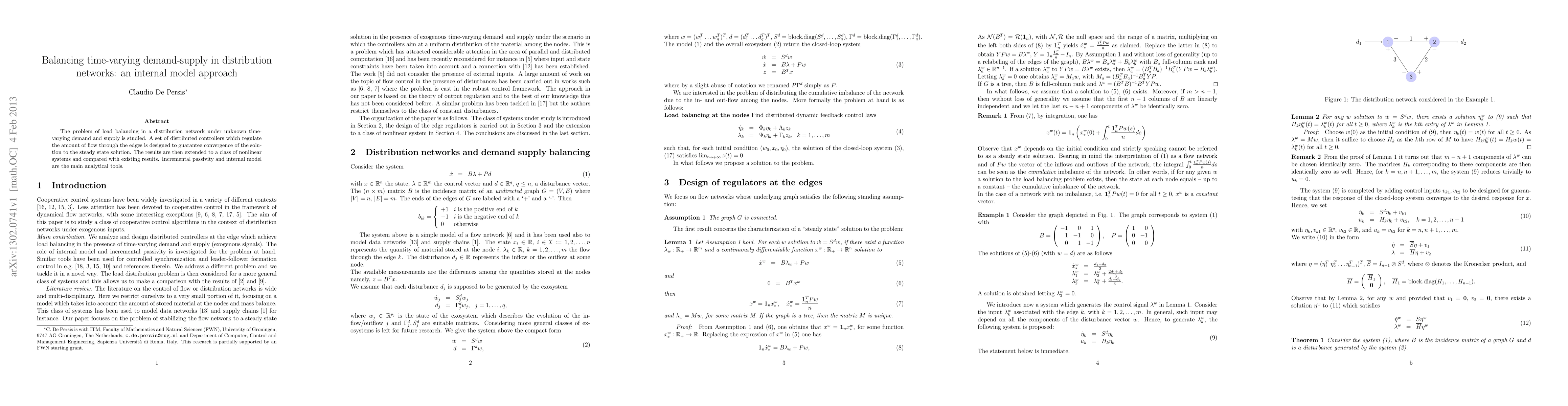 A study on balancing time-varying demand and supply in distribution networks uses a distributed controller design to guarantee convergence to the steady state solution. The approach extends to nonlinear systems and is compared with existing results.