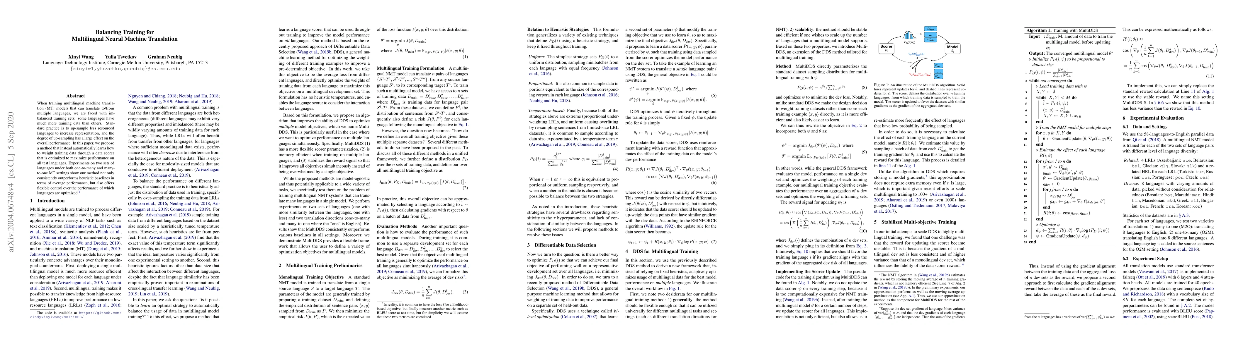 This paper proposes a method to automatically weight training data for multilingual neural machine translation, addressing the issue of imbalanced training sets. The approach uses a data scorer optimized to maximize performance across all languages, outperforming heuristic baselines and providing flexible control over language-specific performance.