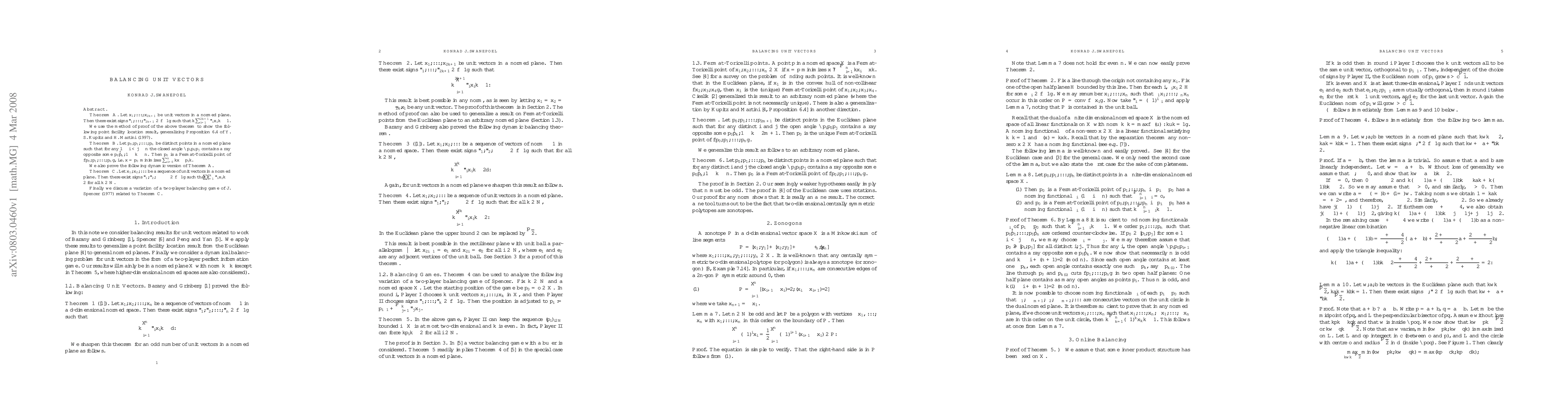 This paper proves a theorem on balancing unit vectors in a normed plane, showing that a specific arrangement of signs can keep the norm of their sum within a bound. It extends this result to a point facility location problem, proving that a certain point minimizes the sum of distances to a set of points under specific angular conditions. Additionally, it presents a dynamic version of the initial theorem and discusses a related balancing game.