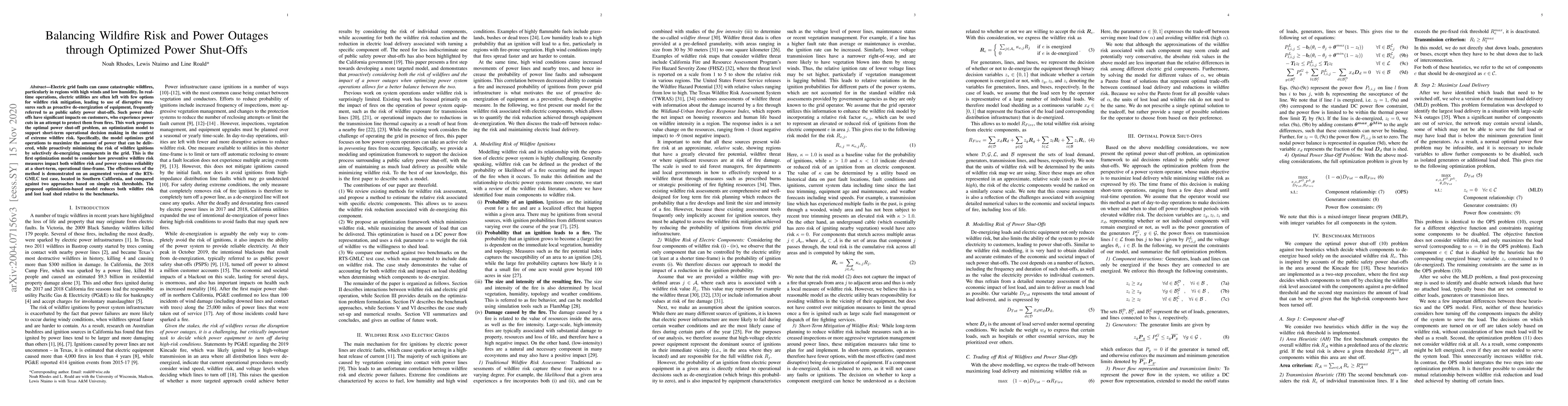 The paper proposes an optimization model that minimizes wildfire risk due to electric power system components while maintaining electricity supply to as many customers as possible, formulated as an optimal power flow problem with additional decision variables to represent component energization status.