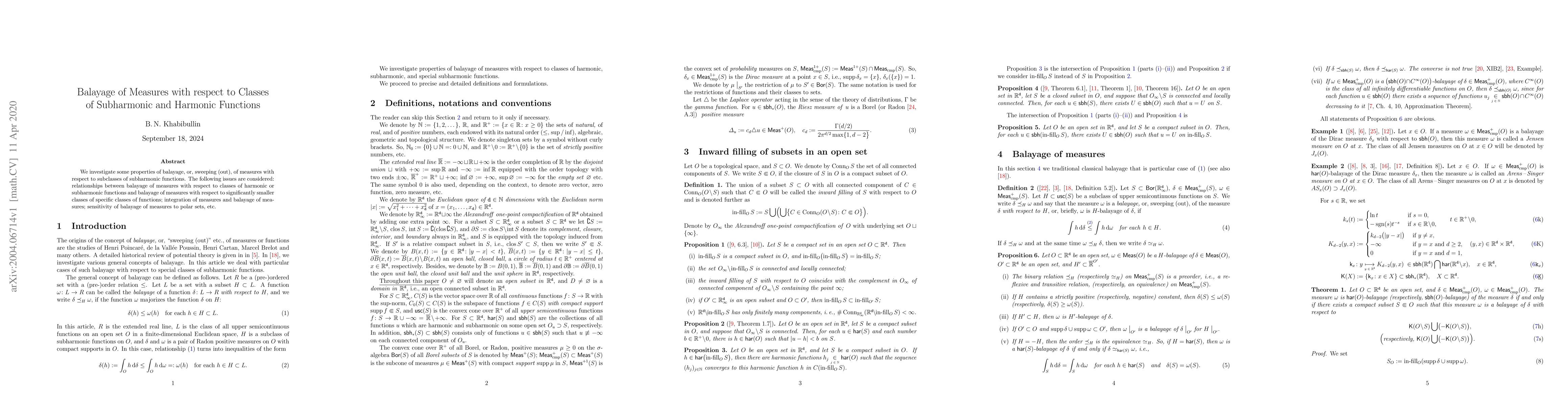 This paper explores the balayage of measures concerning subclasses of subharmonic functions, examining connections with harmonic functions, integration processes, and the sensitivity of balayage to polar sets. It investigates how balayage behaves under different classes of functions and its implications.