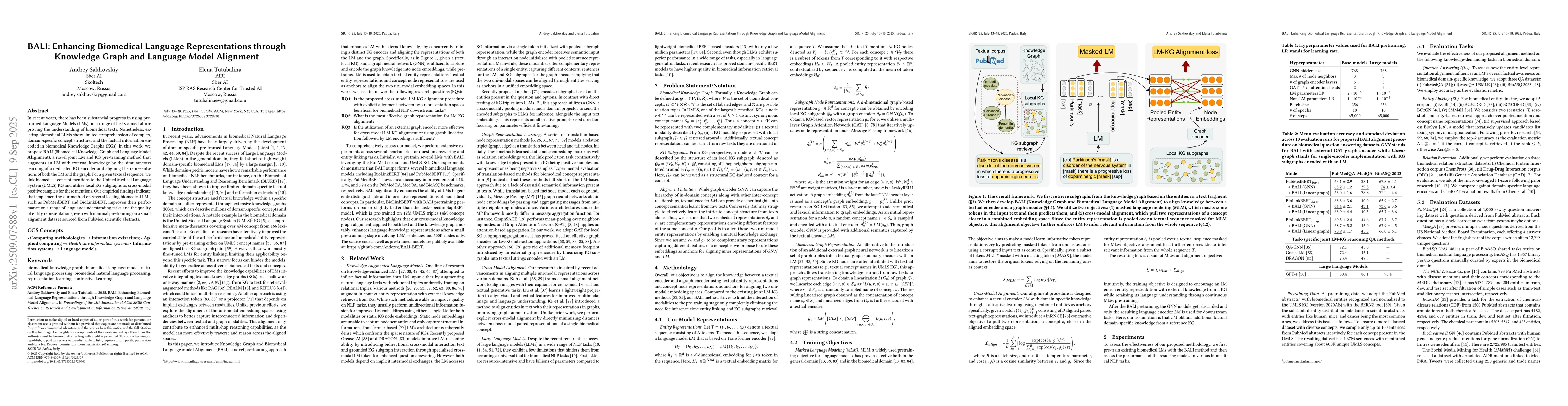 In recent years, there has been substantial progress in using pretrained Language Models (LMs) on a range of tasks aimed at improving the understanding of biomedical texts. Nonetheless, existing biomedical LLMs show limited comprehension of complex, domain-specific concept structures and the factual information encoded in biomedical Knowledge Graphs (KGs). In this work, we propose BALI (Biomedical Knowledge Graph and Language Model Alignment), a novel joint LM and KG pre-training method that augments an LM with external knowledge by the simultaneous learning of a dedicated KG encoder and aligning the representations of both the LM and the graph. For a given textual sequence, we link biomedical concept mentions to the Unified Medical Language System (UMLS) KG and utilize local KG subgraphs as cross-modal positive samples for these mentions. Our empirical findings indicate that implementing our method on several leading biomedical LMs, such as PubMedBERT and BioLinkBERT, improves their performance on a range of language understanding tasks and the quality of entity representations, even with minimal pre-training on a small alignment dataset sourced from PubMed scientific abstracts.