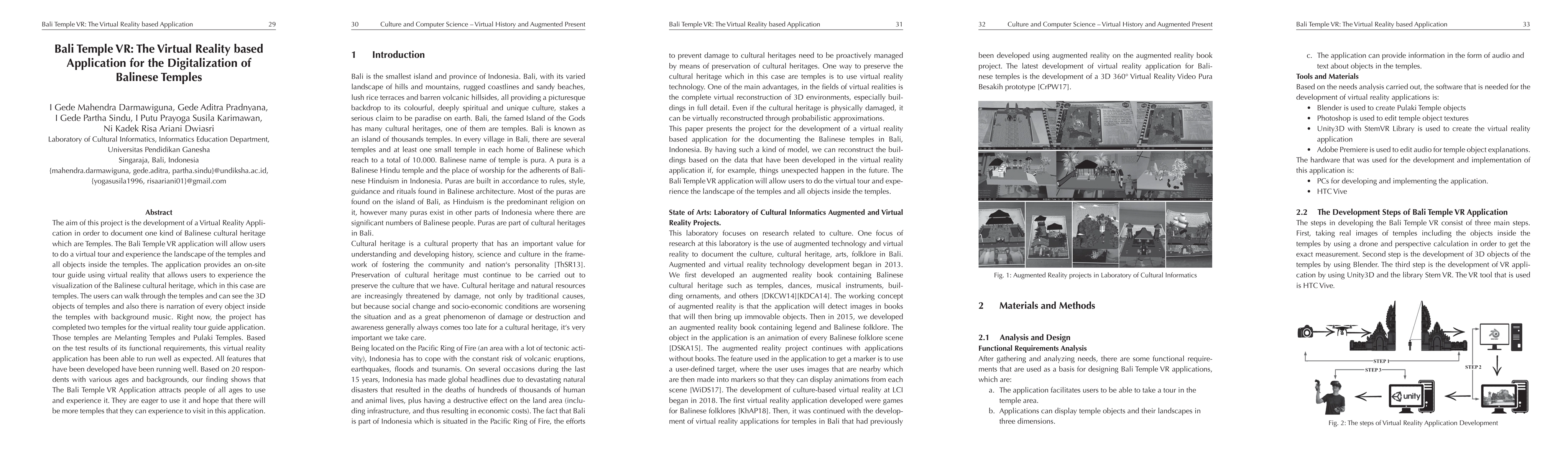 The Bali Temple VR application enables virtual tours of Balinese temples, providing 3D visualizations and guided tours to experience cultural heritage. Initial tests with Melanting and Pulaki temples indicate high user engagement and interest in expanding the application to include more temples.