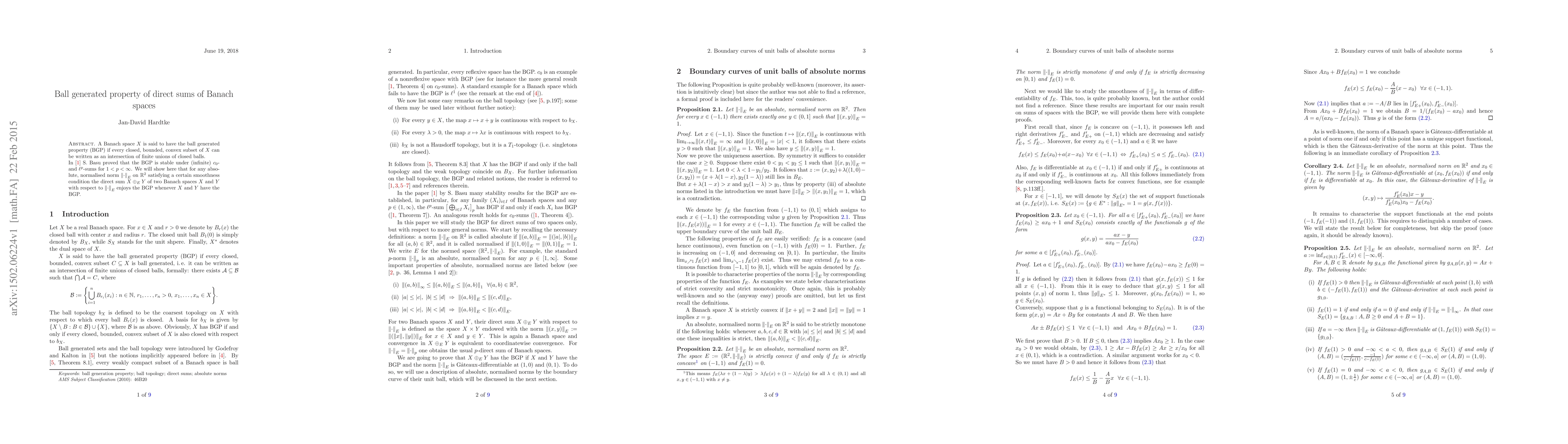 A Banach space $X$ is said to have the ball generated property (BGP) if every closed, bounded, convex subset of $X$ can be written as an intersection of finite unions of closed balls. In 2002 S. Basu proved that the BGP is stable under (infinite) $c_0$- and $\ell^p$-sums for $1
