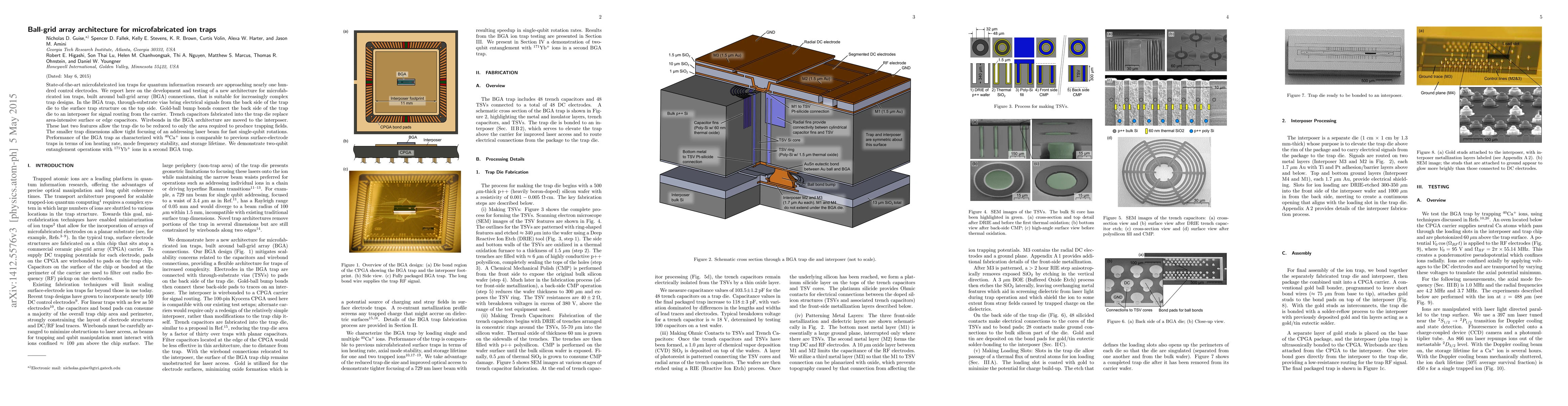The paper introduces a ball-grid array (BGA) architecture for microfabricated ion traps, employing through-substrate vias and trench capacitors to minimize trap dimensions, enabling efficient signal routing and tight laser focusing. The BGA trap demonstrates comparable performance to previous designs while enabling complex trap configurations.