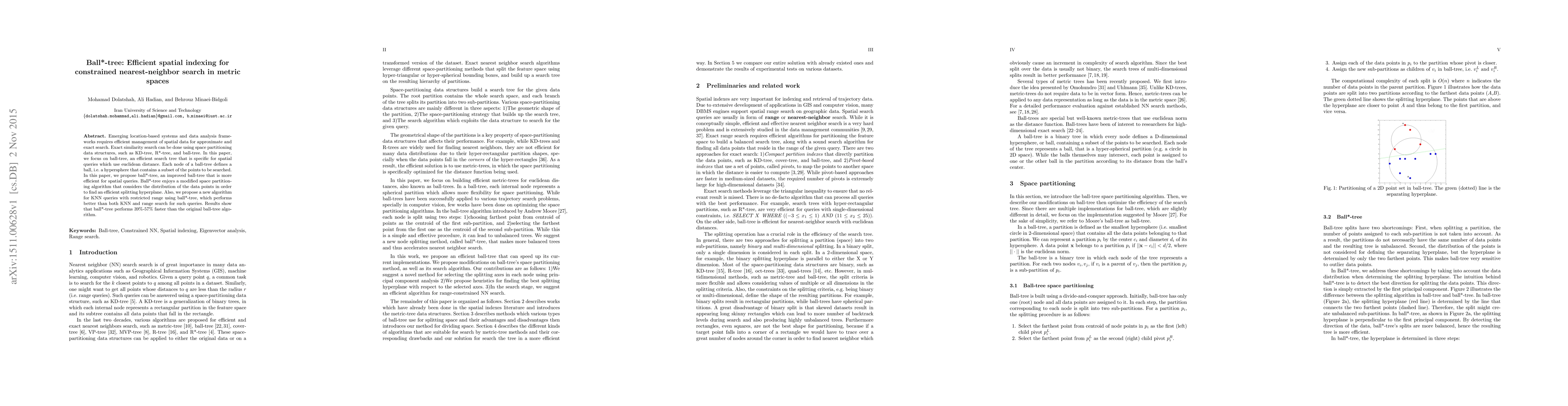 Emerging location-based systems and data analysis frameworks requires efficient management of spatial data for approximate and exact search. Exact similarity search can be done using space partitioning data structures, such as Kd-tree, R*-tree, and Ball-tree. In this paper, we focus on Ball-tree, an efficient search tree that is specific for spatial queries which use euclidean distance. Each node of a Ball-tree defines a ball, i.e. a hypersphere that contains a subset of the points to be searched. In this paper, we propose Ball*-tree, an improved Ball-tree that is more efficient for spatial queries. Ball*-tree enjoys a modified space partitioning algorithm that considers the distribution of the data points in order to find an efficient splitting hyperplane. Also, we propose a new algorithm for KNN queries with restricted range using Ball*-tree, which performs better than both KNN and range search for such queries. Results show that Ball*-tree performs 39%-57% faster than the original Ball-tree algorithm.
