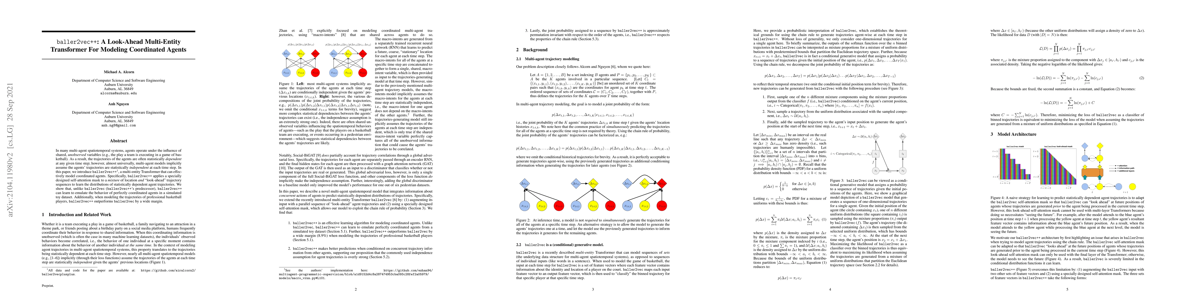 In many multi-agent spatiotemporal systems, agents operate under the influence of shared, unobserved variables (e.g., the play a team is executing in a game of basketball). As a result, the trajectories of the agents are often statistically dependent at any given time step; however, almost universally, multi-agent models implicitly assume the agents' trajectories are statistically independent at each time step. In this paper, we introduce baller2vec++, a multi-entity Transformer that can effectively model coordinated agents. Specifically, baller2vec++ applies a specially designed self-attention mask to a mixture of location and "look-ahead" trajectory sequences to learn the distributions of statistically dependent agent trajectories. We show that, unlike baller2vec (baller2vec++'s predecessor), baller2vec++ can learn to emulate the behavior of perfectly coordinated agents in a simulated toy dataset. Additionally, when modeling the trajectories of professional basketball players, baller2vec++ outperforms baller2vec by a wide margin.