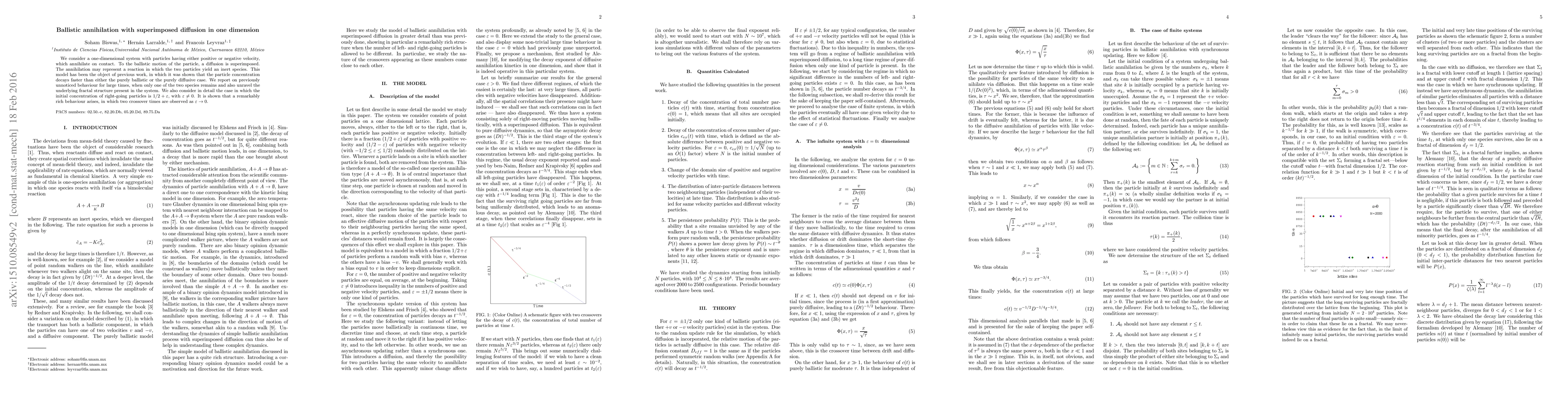 We consider a one-dimensional system with particles having either positive or negative velocity, which annihilate on contact. To the ballistic motion of the particle, a diffusion is superimposed. The annihilation may represent a reaction in which the two particles yield an inert species. This model has been the object of previous work, in which it was shown that the particle concentration decays faster than either the purely ballistic or the purely diffusive case. We report on previously unnoticed behaviour for large times, when only one of the two species remains and also unravel the underlying fractal structure present in the system. We also consider in detail the case in which the initial concentration of right-going particles is $1/2+\varepsilon$, with $\varepsilon\neq0$. It is shown that a remarkably rich behaviour arises, in which two crossover times are observed as $\varepsilon \to 0$.