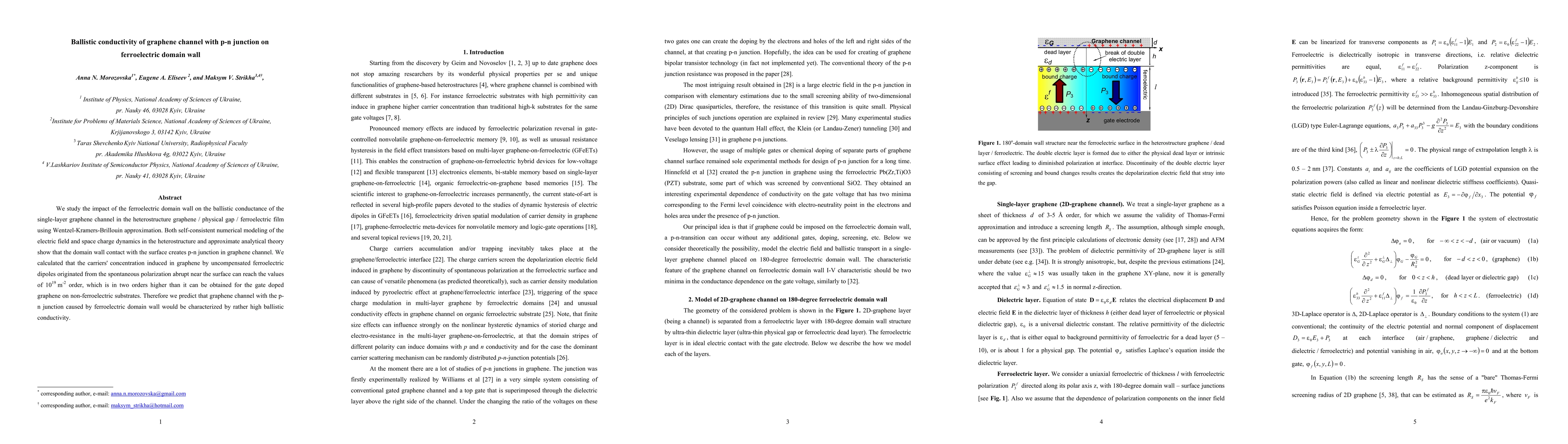 We study the impact of the ferroelectric domain wall on the ballistic conductance of the single-layer graphene channel in the heterostructure graphene / physical gap / ferroelectric film using Wentzel-Kramers-Brillouin approximation. Both self-consistent numerical modeling of the electric field and space charge dynamics in the heterostructure and approximate analytical theory show that the domain wall contact with the surface creates p-n junction in graphene channel. We calculated that the carriers' concentration induced in graphene by uncompensated ferroelectric dipoles originated from the spontaneous polarization abrupt near the surface can reach the values of 1019 m-2 order, which is in two orders higher than it can be obtained for the gate doped graphene on non-ferroelectric substrates. Therefore we predict that graphene channel with the p-n junction caused by ferroelectric domain wall would be characterized by rather high ballistic conductivity.