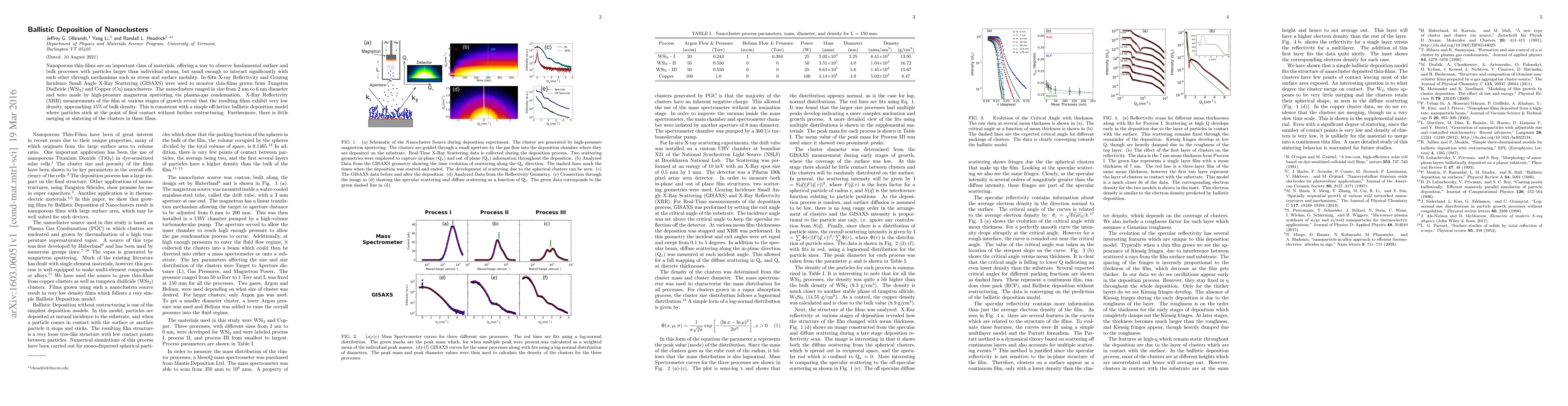 This study investigates the ballistic deposition of Tungsten Disilicide (WSi$_2$) and Copper (Cu) nanoclusters using high-pressure magnetron sputtering, revealing low-density nanoporous thin-films with minimal merging or sintering, consistent with an off-lattice deposition model. In-situ X-ray Reflectivity and GISAXS were employed to monitor the growth process.