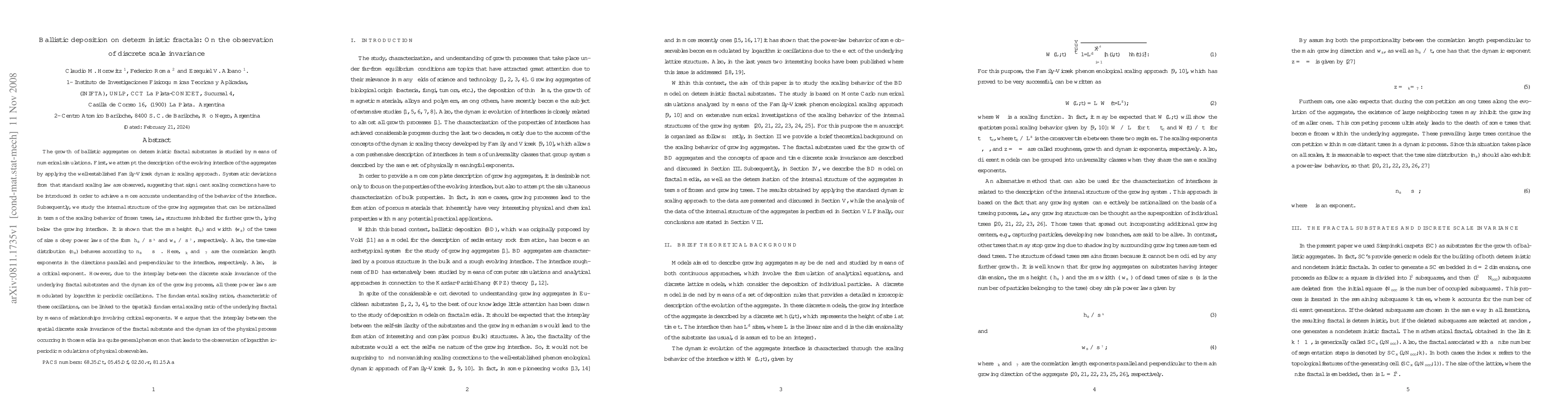 Researchers study how particles deposit on fractals, finding that the process exhibits discrete scale invariance with power-law relationships between particle sizes, shapes, and distributions, but these patterns are modulated by logarithmic oscillations.