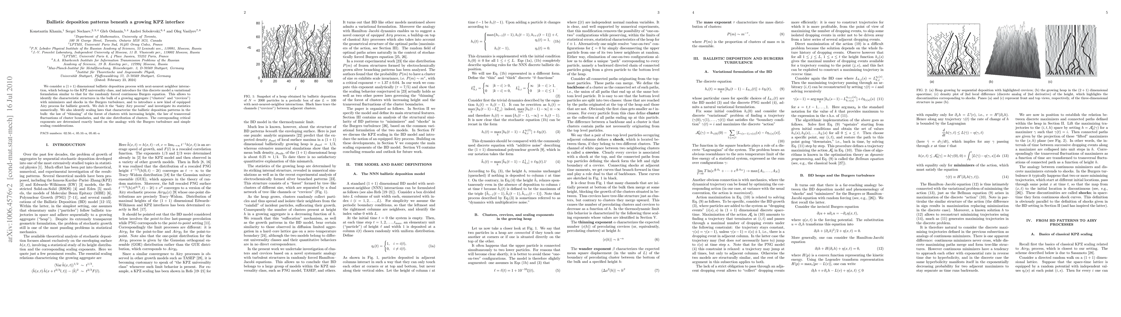 This paper explores a ballistic deposition process in the KPZ universality class, introducing a variational formulation to identify characteristic bulk structures and defining a new "hairy Airy process." It numerically investigates the statistical properties and scaling laws of the deposition patterns, determining critical exponents through analogies with Burgers turbulence.