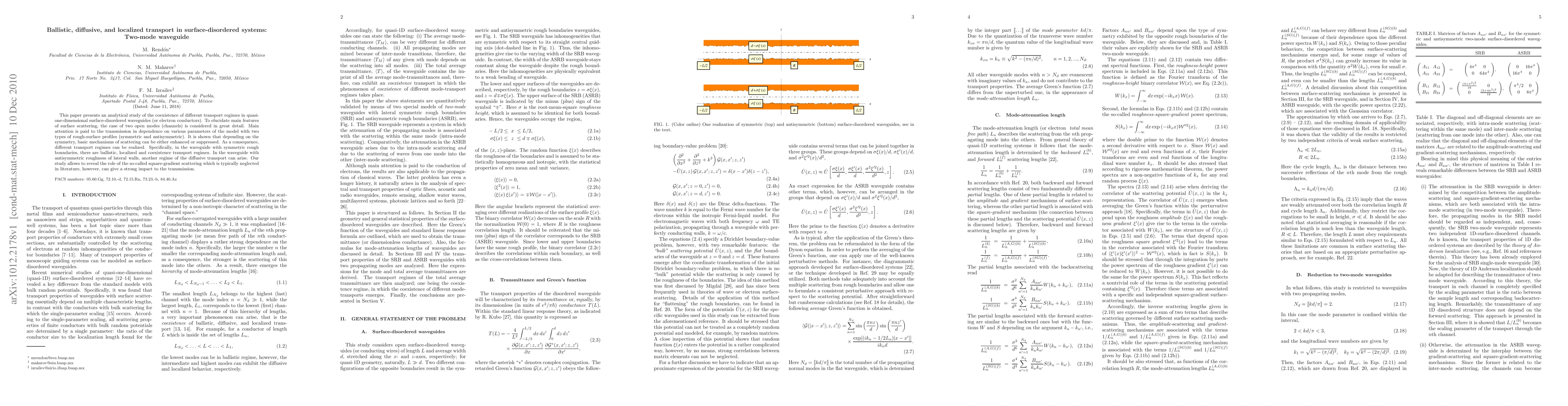 This paper presents an analytical study of the coexistence of different transport regimes in quasi-one-dimensional surface-disordered waveguides (or electron conductors). To elucidate main features of surface scattering, the case of two open modes (channels) is considered in great detail. Main attention is paid to the transmission in dependence on various parameters of the model with two types of rough-surface profiles (symmetric and antisymmetric). It is shown that depending on the symmetry, basic mechanisms of scattering can be either enhanced or suppressed. As a consequence, different transport regimes can be realized. Specifically, in the waveguide with symmetric rough boundaries, there are ballistic, localized and coexistence transport regimes. In the waveguide with antisymmetric roughness of lateral walls, another regime of the diffusive transport can arise. Our study allows to reveal the role of the so-called square-gradient scattering which is typically neglected in literature, however, can give a strong impact to the transmission.