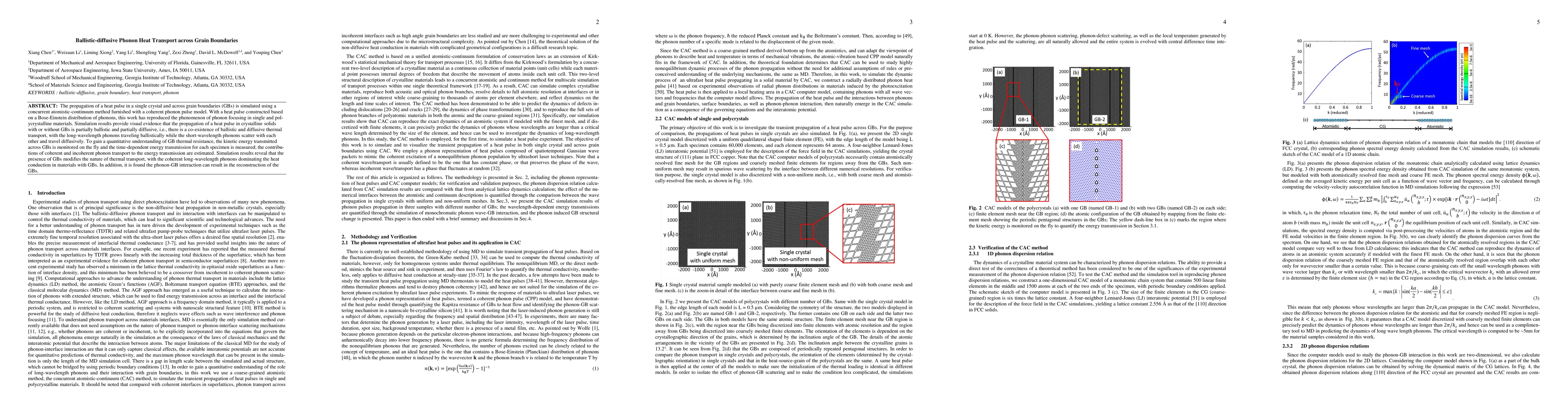 This paper uses an atomistic-continuum method to simulate phonon heat transport across grain boundaries, showing both ballistic and diffusive transport modes. The study reveals that grain boundaries modify thermal transport, with coherent long-wavelength phonons dominating conduction and indicating that phonon-GB interactions can alter boundary structure.