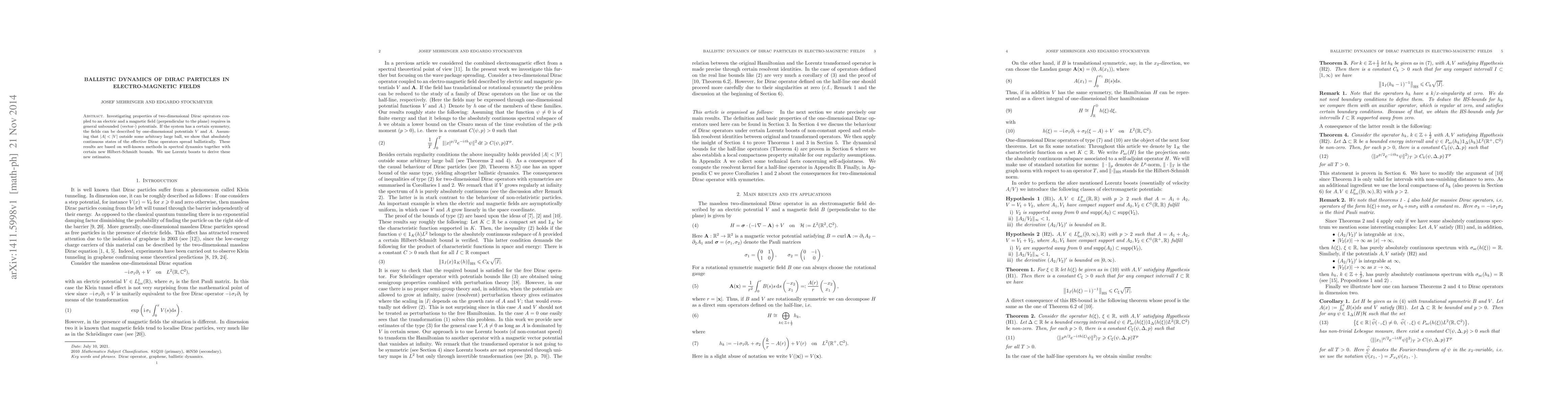 Investigating properties of two-dimensional Dirac operators coupled to an electric and a magnetic field (perpendicular to the plane) requires in general unbounded (vector-) potentials. If the system has a certain symmetry, the fields can be described by one-dimensional potentials $V$ and $A$. Assuming that $|A|<|V|$ outside some arbitrary large ball, we show that absolutely continuous states of the effective Dirac operators spread ballistically. These results are based on well-known methods in spectral dynamics together with certain new Hilbert-Schmidt bounds. We use Lorentz boosts to derive these new estimates.