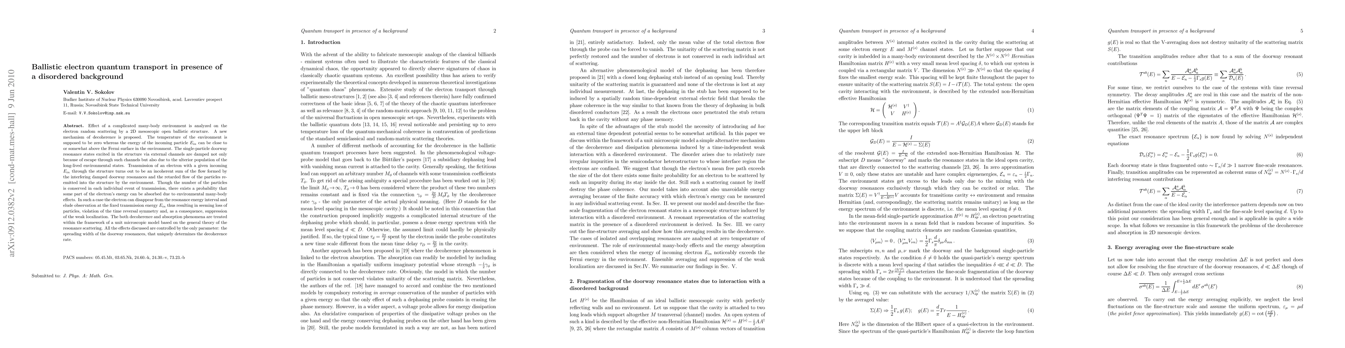 Effect of a complicated many-body environment is analyzed on the electron random scattering by a 2D mesoscopic open ballistic structure. A new mechanism of decoherence is proposed. The temperature of the environment is supposed to be zero whereas the energy of the incoming particle $E_{in}$ can be close to or somewhat above the Fermi surface in the environment. The single-particle doorway resonance states excited in the structure via external channels are damped not only because of escape through such channels but also due to the ulterior population of the long-lived environmental states. Transmission of an electron with a given incoming $E_{in}$ through the structure turns out to be an incoherent sum of the flow formed by the interfering damped doorway resonances and the retarded flow of the particles re-emitted into the structure by the environment. Though the number of the particles is conserved in each individual event of transmission, there exists a probability that some part of the electron's energy can be absorbed due to environmental many-body effects. In such a case the electron can disappear from the resonance energy interval and elude observation at the fixed transmission energy $E_{in}$ thus resulting in seeming loss of particles, violation of the time reversal symmetry and, as a consequence, suppression of the weak localization. The both decoherence and absorption phenomena are treated within the framework of a unit microscopic model based on the general theory of the resonance scattering. All the effects discussed are controlled by the only parameter: the spreading width of the doorway resonances, that uniquely determines the decoherence rate
