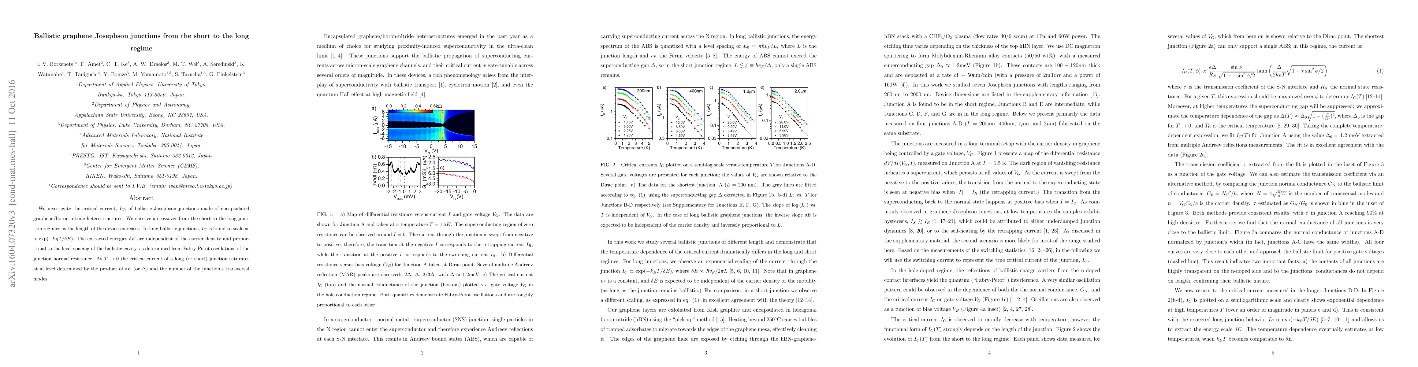 This paper investigates the critical current of ballistic graphene Josephson junctions, revealing a transition from short to long junction behavior with increasing device length. Long junctions exhibit an exponential scaling of critical current dependent on extracted energies, which correlate with the level spacing in the junction's ballistic cavity.