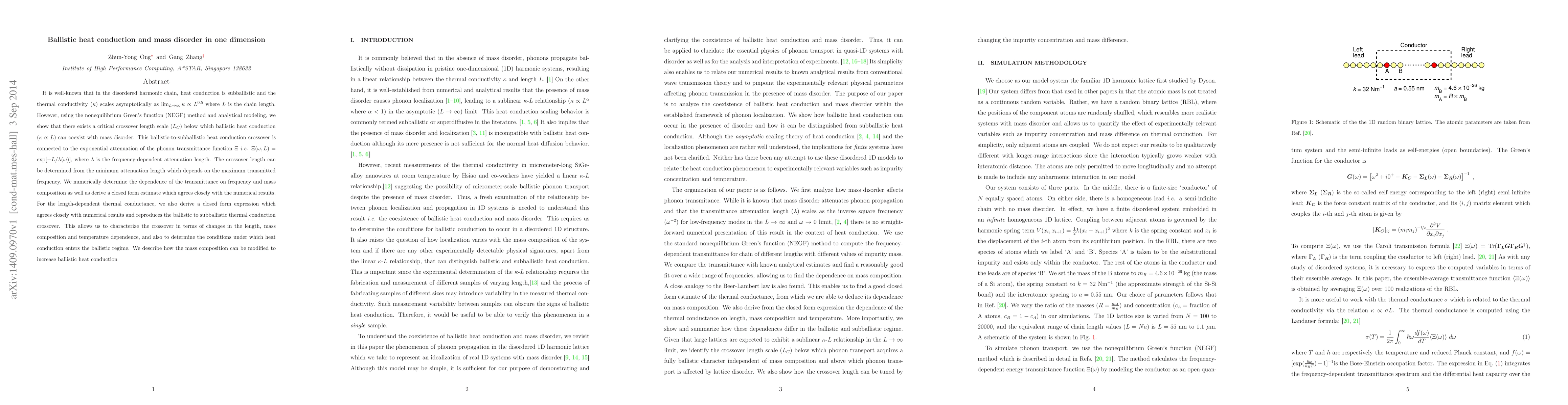 This paper investigates ballistic heat conduction in disordered harmonic chains using the nonequilibrium Green's function method. It demonstrates a critical crossover length where ballistic heat conduction emerges alongside mass disorder, contrasting with traditional subballistic conduction. The study characterizes this crossover in terms of frequency-dependent attenuation and provides closed-form expressions for thermal conductance that match numerical results.