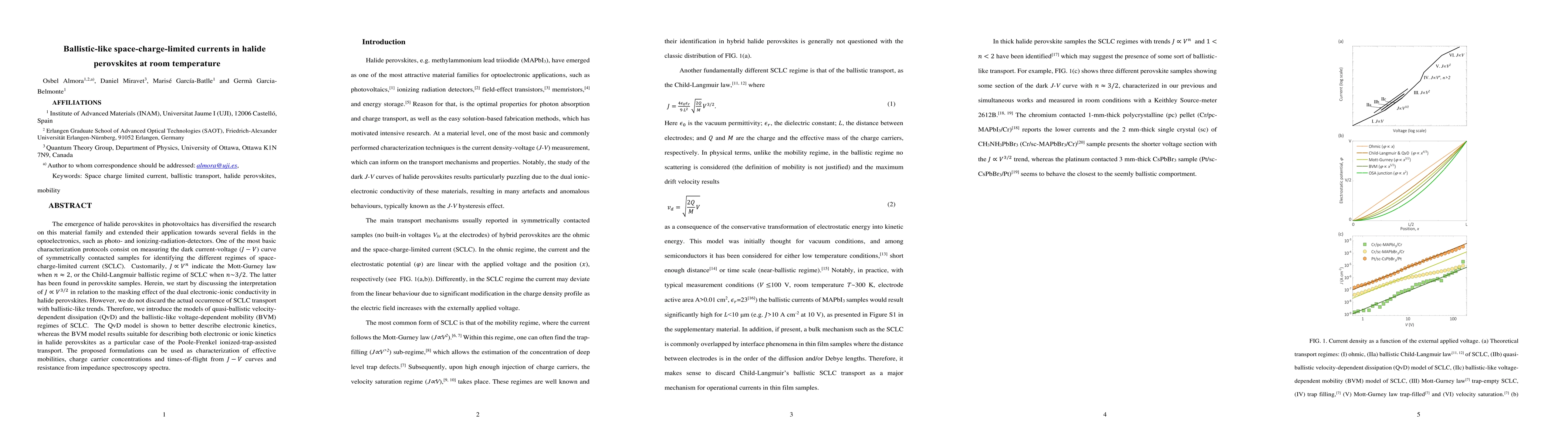 This paper investigates the ballistic-like space-charge-limited currents (SCLC) in halide perovskites at room temperature, proposing quasi-ballistic velocity-dependent dissipation (QvD) and ballistic-like voltage-dependent mobility (BVM) models to describe electronic and ionic kinetics. The findings suggest these models can evaluate effective mobilities, charge carrier concentrations, and times-of-flight from current-voltage and impedance spectroscopy data.