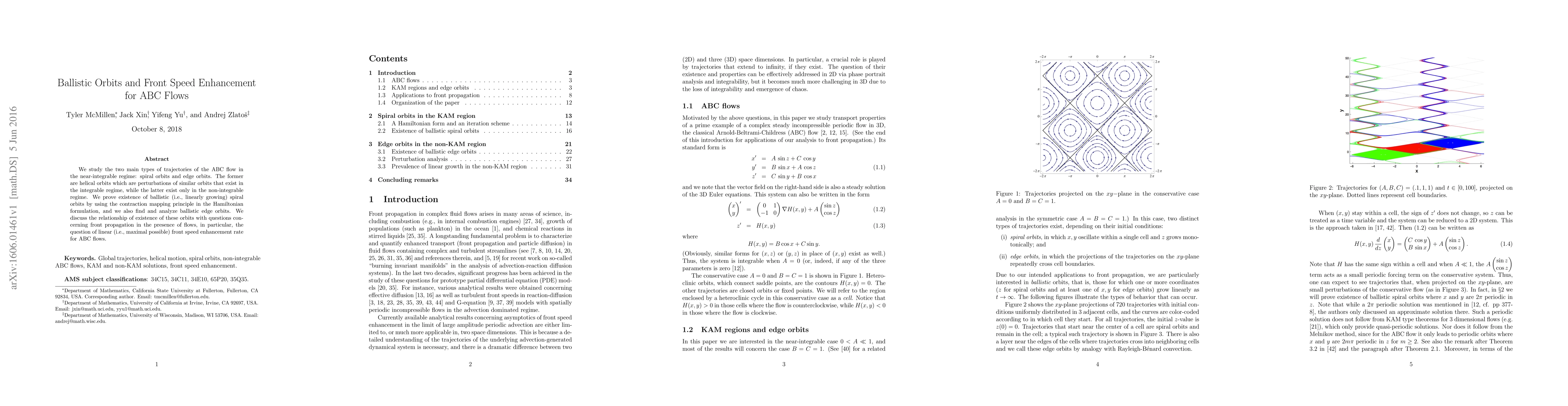 This paper investigates the trajectory types in near-integrable ABC flows, proving the existence of ballistic spiral and edge orbits using the contraction mapping principle. It also explores the connection between these orbits and the maximal possible front speed enhancement in flow-influenced propagation.