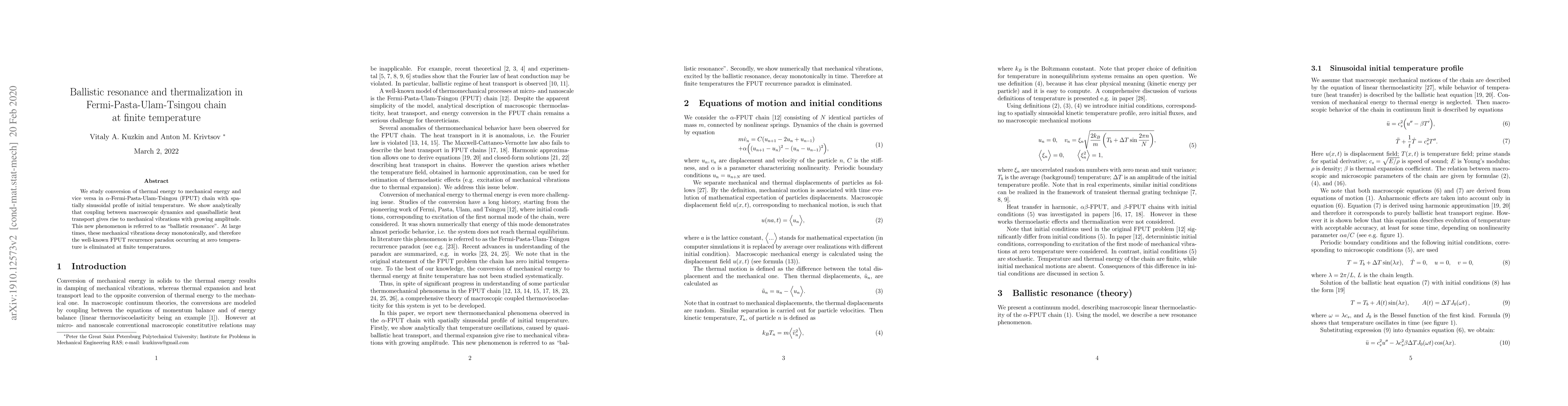We study conversion of thermal energy to mechanical energy and vice versa in $\alpha$-Fermi-Pasta-Ulam-Tsingou~(FPUT) chain with spatially sinusoidal profile of initial temperature. We show analytically that coupling between macroscopic dynamics and quasiballistic heat transport gives rise to mechanical vibrations with growing amplitude. This new phenomenon is referred to as "ballistic resonance". At large times, these mechanical vibrations decay monotonically, and therefore the well-known FPUT recurrence paradox occurring at zero temperature is eliminated at finite temperatures.