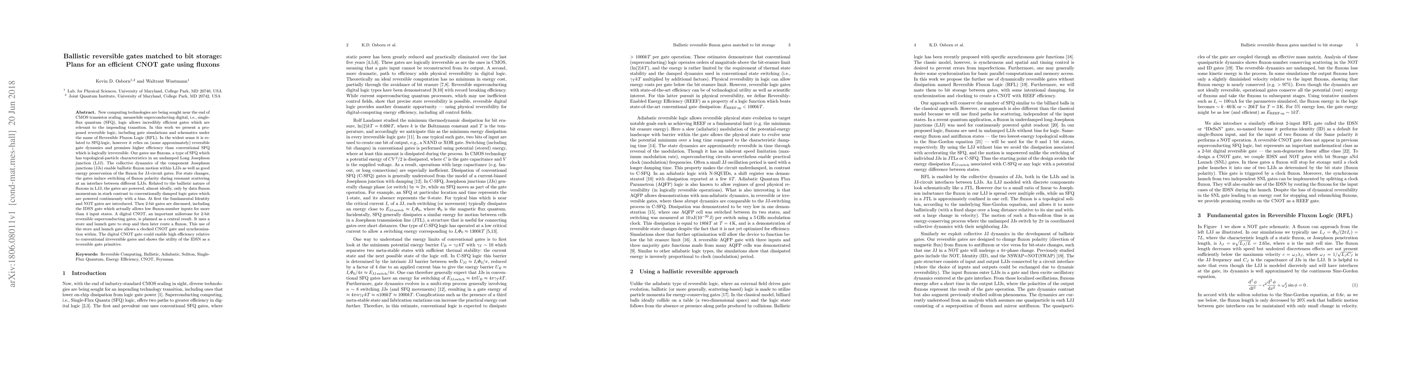 This paper proposes a new reversible logic framework called Reversible Fluxon Logic (RFL) for efficient computing beyond CMOS scaling. It introduces ballistic gates using fluxons in undamped Long Josephson junctions, enabling high efficiency and minimal power consumption, and presents a digital CNOT gate as a significant milestone for 2-bit reversible superconducting logic.
