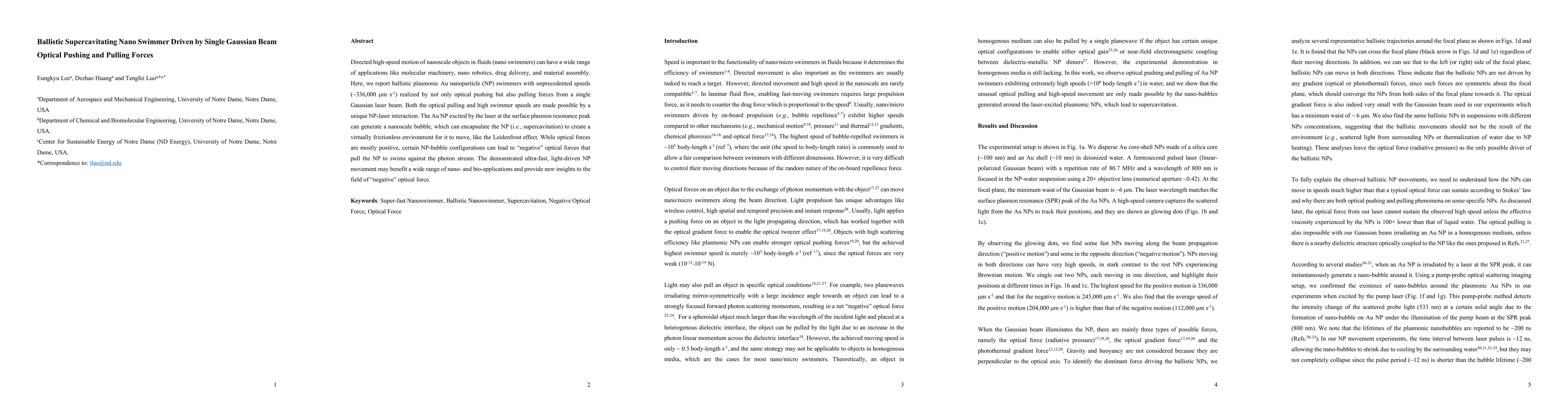 Directed high-speed motion of nanoscale objects in fluids (nano swimmers) can have a wide range of applications like molecular machinery, nano robotics, drug delivery, and material assembly. Here, we report ballistic plasmonic Au nanoparticle (NP) swimmers with unprecedented speeds realized by not only optical pushing but also pulling forces from a single Gaussian laser beam. Both the optical pulling and high swimmer speeds are made possible by a unique NP-laser interaction. The Au NP excited by the laser at the surface plasmon resonance peak can generate a nanoscale bubble, which can encapsulate the NP (i.e., supercavitation) to create a virtually frictionless environment for it to move, like the Leidenfrost effect. While optical forces are mostly positive, certain NP-bubble configurations can lead to negative optical forces that pull the NP to swims against the photon stream. The demonstrated ultra-fast, light-driven NP movement may benefit a wide range of nano- and bio-applications and provide new insights to the field of negative optical force.