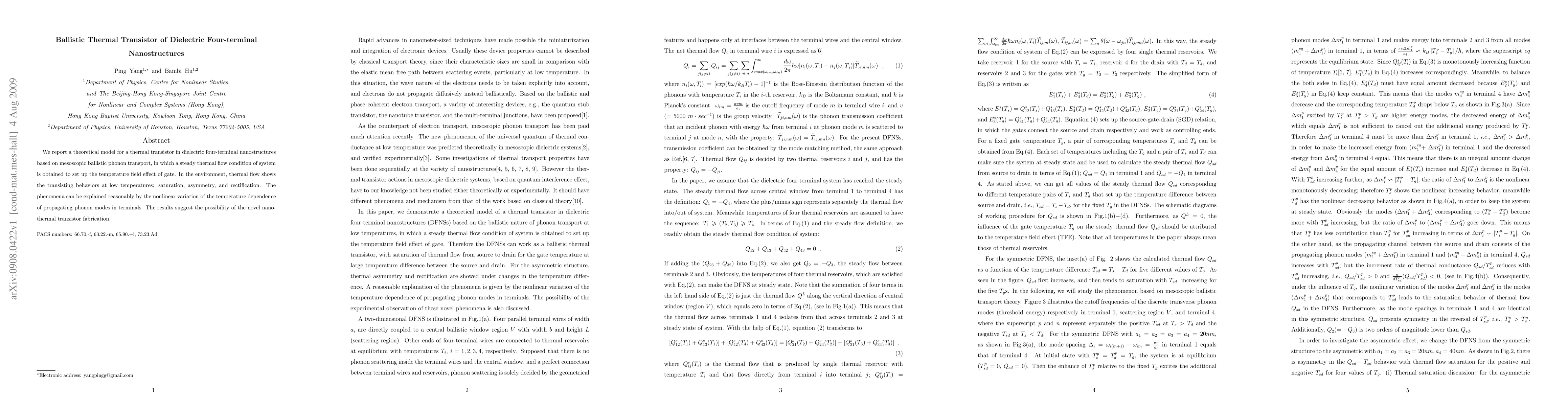 This paper proposes a theoretical model for a thermal transistor in dielectric four-terminal nanostructures based on ballistic phonon transport, demonstrating transiting behaviors such as saturation, asymmetry, and rectification at low temperatures. The findings suggest potential for novel nano-thermal transistor fabrication.