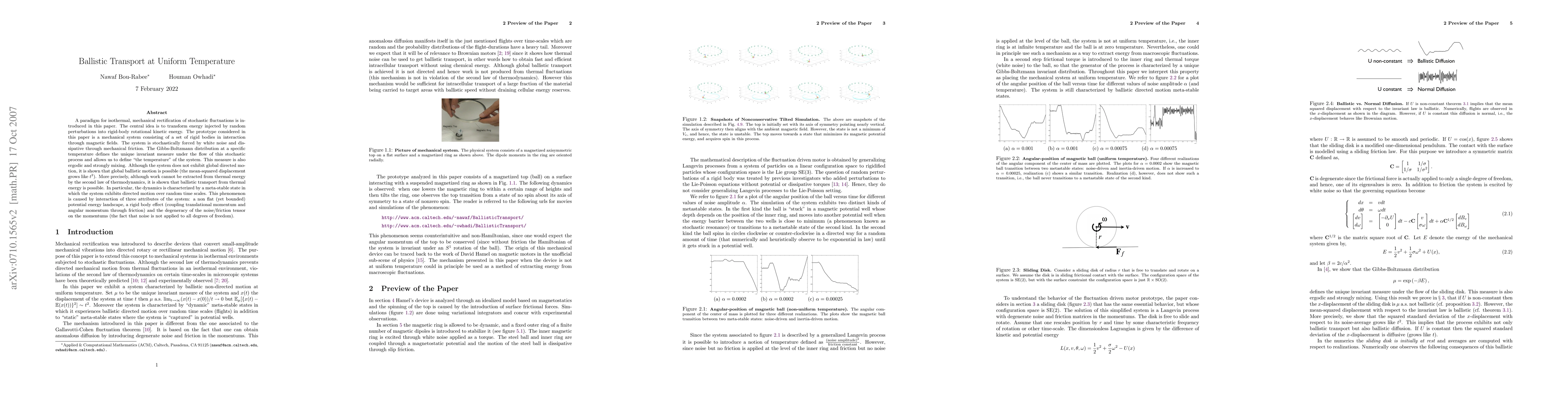 A paradigm for isothermal, mechanical rectification of stochastic fluctuations is introduced in this paper. The central idea is to transform energy injected by random perturbations into rigid-body rotational kinetic energy. The prototype considered in this paper is a mechanical system consisting of a set of rigid bodies in interaction through magnetic fields. The system is stochastically forced by white noise and dissipative through mechanical friction. The Gibbs-Boltzmann distribution at a specific temperature defines the unique invariant measure under the flow of this stochastic process and allows us to define ``the temperature'' of the system. This measure is also ergodic and weakly mixing. Although the system does not exhibit global directed motion, it is shown that global ballistic motion is possible (the mean-squared displacement grows like t squared). More precisely, although work cannot be extracted from thermal energy by the second law of thermodynamics, it is shown that ballistic transport from thermal energy is possible. In particular, the dynamics is characterized by a meta-stable state in which the system exhibits directed motion over random time scales. This phenomenon is caused by interaction of three attributes of the system: a non flat (yet bounded) potential energy landscape, a rigid body effect (coupling translational momentum and angular momentum through friction) and the degeneracy of the noise/friction tensor on the momentums (the fact that noise is not applied to all degrees of freedom).