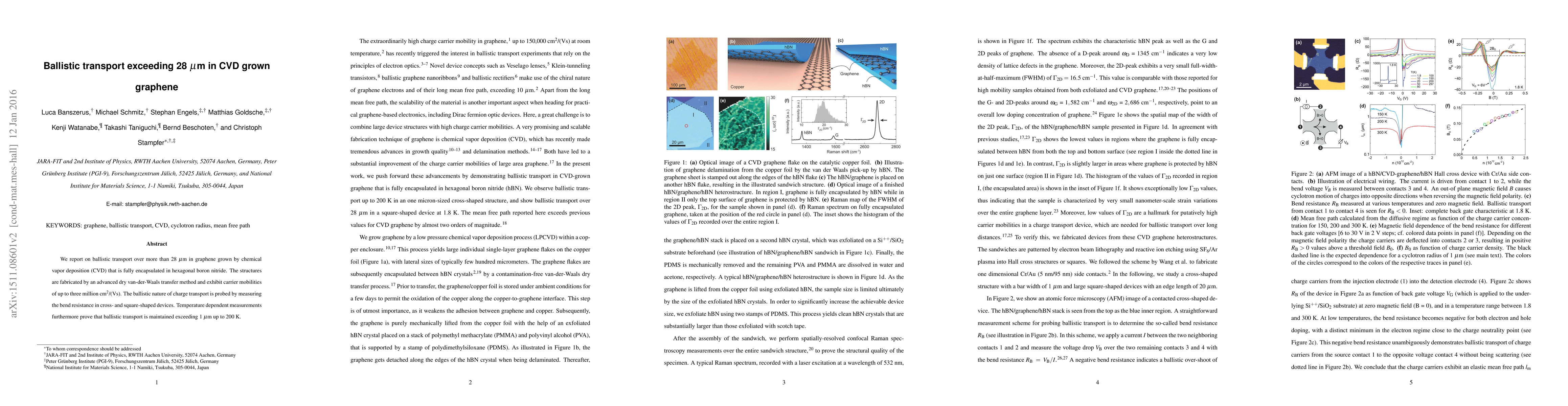 This study demonstrates ballistic transport exceeding 28 μm in CVD-grown graphene fully encapsulated in hexagonal boron nitride, achieving carrier mobilities up to 3 million cm²/(Vs) and maintaining ballistic properties up to 200 K. Advanced dry transfer methods were used to fabricate the structures.