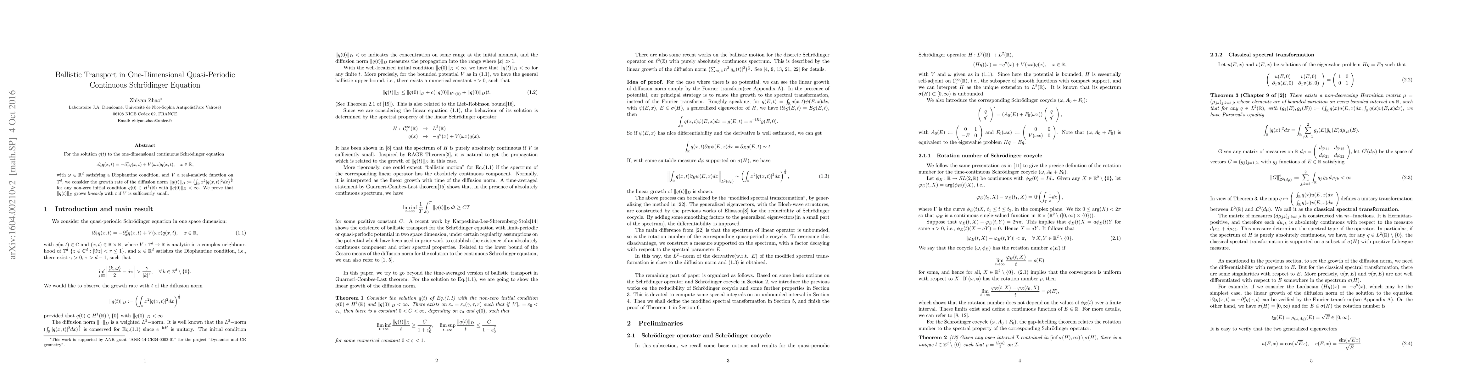 This paper investigates the ballistic transport in a one-dimensional quasi-periodic Schrödinger equation under a Diophantine condition. It proves that the diffusion norm grows linearly with time for sufficiently small potential perturbations.