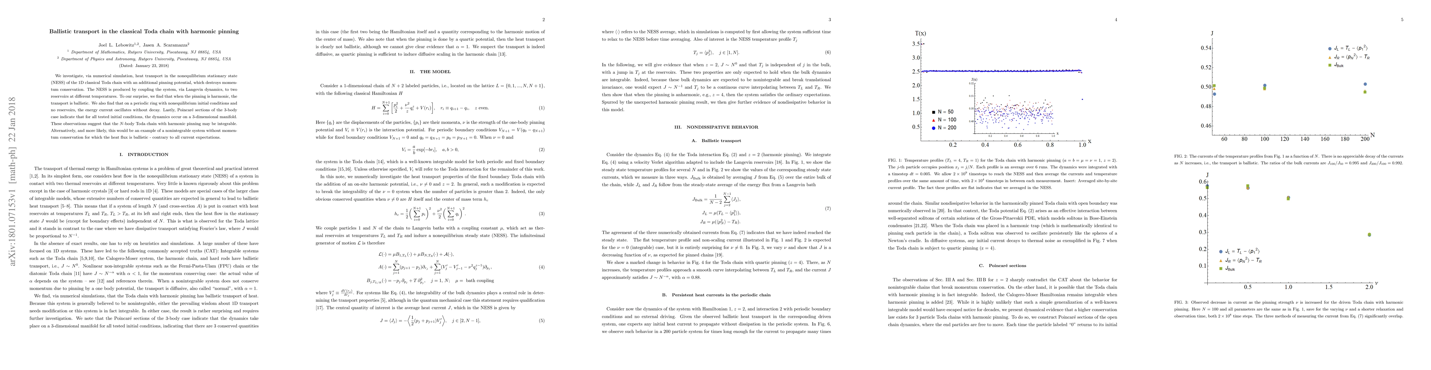 This study uses numerical simulations to explore heat transport in the nonequilibrium stationary state of the 1D Toda chain with harmonic pinning, finding ballistic transport contrary to expectations. The harmonic pinning disrupts momentum conservation, yet energy currents oscillate without decay, suggesting potential integrability or unexpected ballistic heat flux in nonintegrable systems.